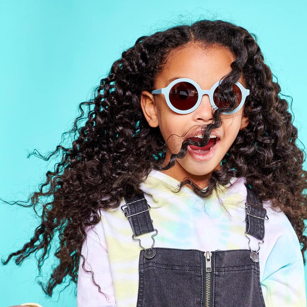 Ấn tượng: Kính chống tia cực tím với thiết kế hình tròn đáng yêu và màu xanh êm dịu phù hợp với cả bé trai và bé gái