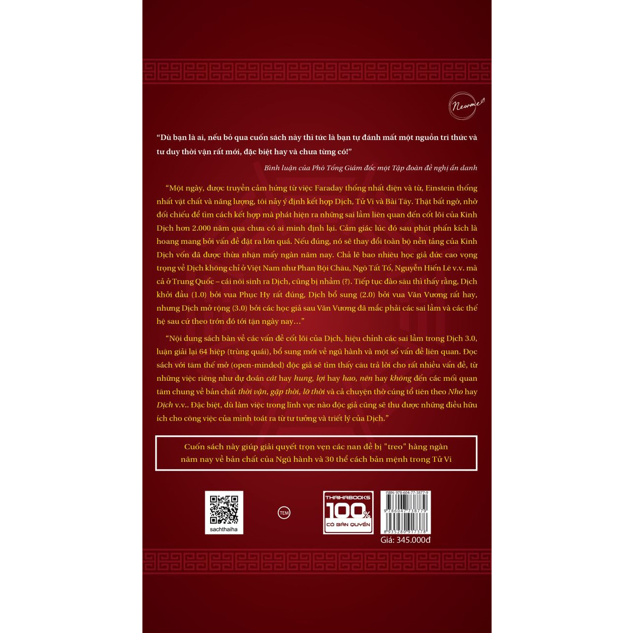 “Dù bạn là ai, nếu bỏ qua cuốn sách này thì tức là bạn tự đánh mất một nguồn tri thức và tư duy thời vận rất mới, đặc biệt hay và chưa từng có!”