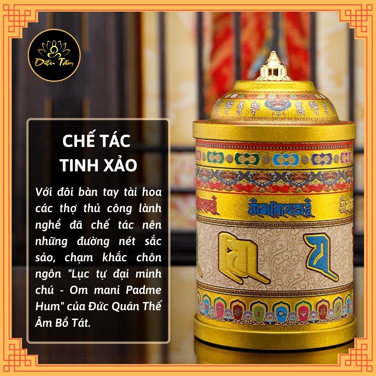 • Kinh luân gồm một hình trụ xoay trên một trục ở trung tâm. Những cuộnkinh ghi chân ngôn được quấn bên trong quanh trục này và vỏ bên ngoài thường chạm khảm chân ngôn Lục Tự Đại Minh “Om Mani Padme Hum” của Đức Quán Thế Âm Bồ Tát. Có thể đặt kinh luân ở trong nhà, phòng khách, phòng thờ, phòng ngủ, công ty, cửa hàng,… đều rất lợi lạc và an bình.