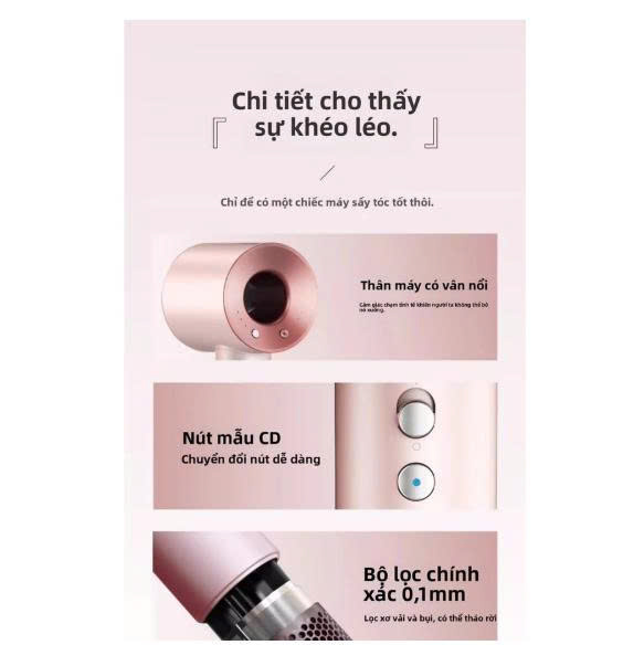 • Nhỏ gọn, dễ mang theo khi đi du lịch, công tác hoặc làm quà tặng người thân yêu. BỘ SẢN PHẨM GỒM CÓ   01 Máy sấy tóc không lá cao cấp 01 Đầu sấy tập trung luồng gió 01 Hộp đựng da sang trọng Phiếu bảo hành & hướng dẫn sử dụng PHÙ HỢP CHO MỌI LOẠI TÓC Dù tóc bạn là tóc dày, tóc nhuộm, tóc uốn hay tóc yếu dễ gãy – máy đều có chế độ gió & nhiệt phù hợp, giúp tóc khô nhanh nhưng vẫn giữ được độ ẩm tự nhiên và độ bóng khỏe. MÓN QUÀ TẶNG HOÀN HẢO Với thiết kế tinh tế và hộp đựng sang trọng, đây là món quà ý nghĩa dành cho mẹ, bạn gái, vợ hoặc chính bạn – món quà thể hiện sự quan tâm và yêu thương. ĐÁNH GIÁ TỪ KHÁCH HÀNG “Máy sấy nhanh, nhẹ, êm, sấy xong tóc mềm mượt chứ không bị khô xơ như máy thường.” “Hộp đựng sang trọng, mua về làm quà rất ưng.” “Thiết kế siêu xinh, dùng thích, cảm giác như đang dùng hàng cao cấp vậy!” THÔNG SỐ KỸ THUẬT