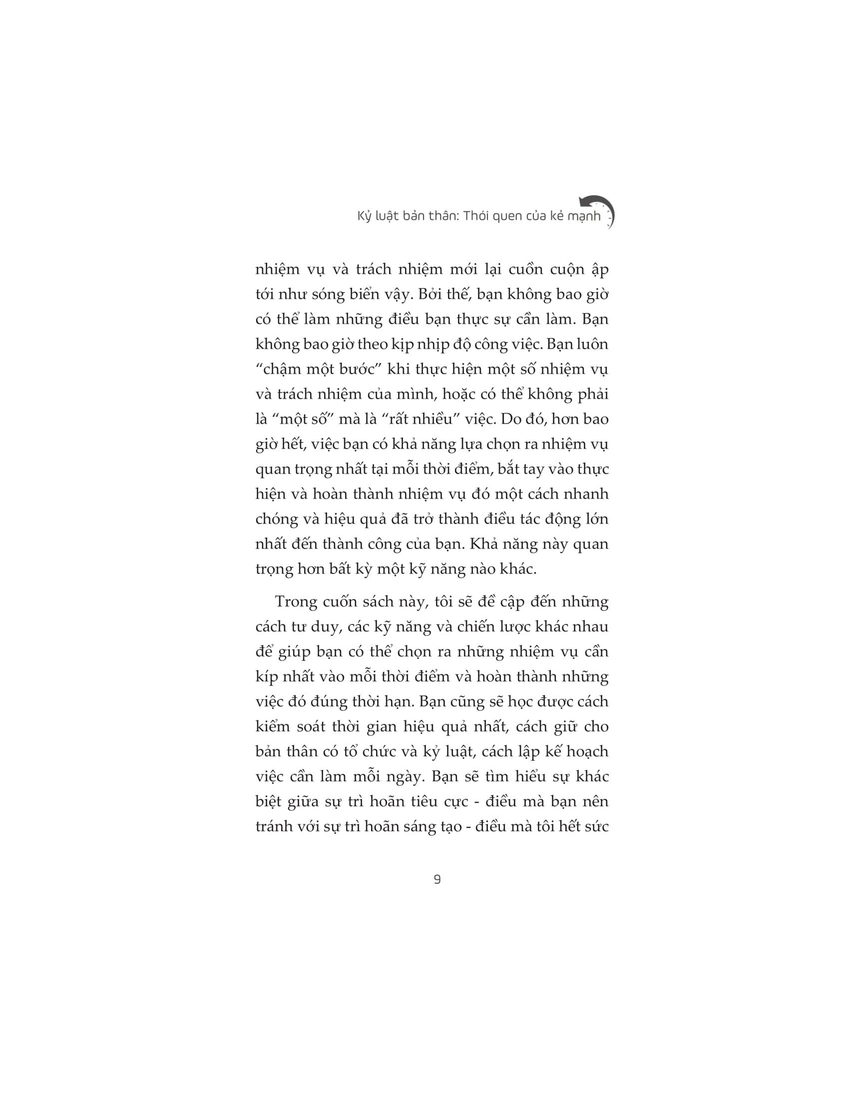 Trong một thời đại mà con người quá dễ mất tập trung, cạn kiệt năng lượng vì những thứ không quan trọng và không còn thời gian để phát triển bản thân, hãy trở thành một ngoại lệ. Hãy duy trì kỷ luật, nói không với trì hoãn, hành động nhanh chóng và hành động ngay bây giờ, để vững vàng tiến thêm một bước hướng đến những mục tiêu to lớn của bạn.