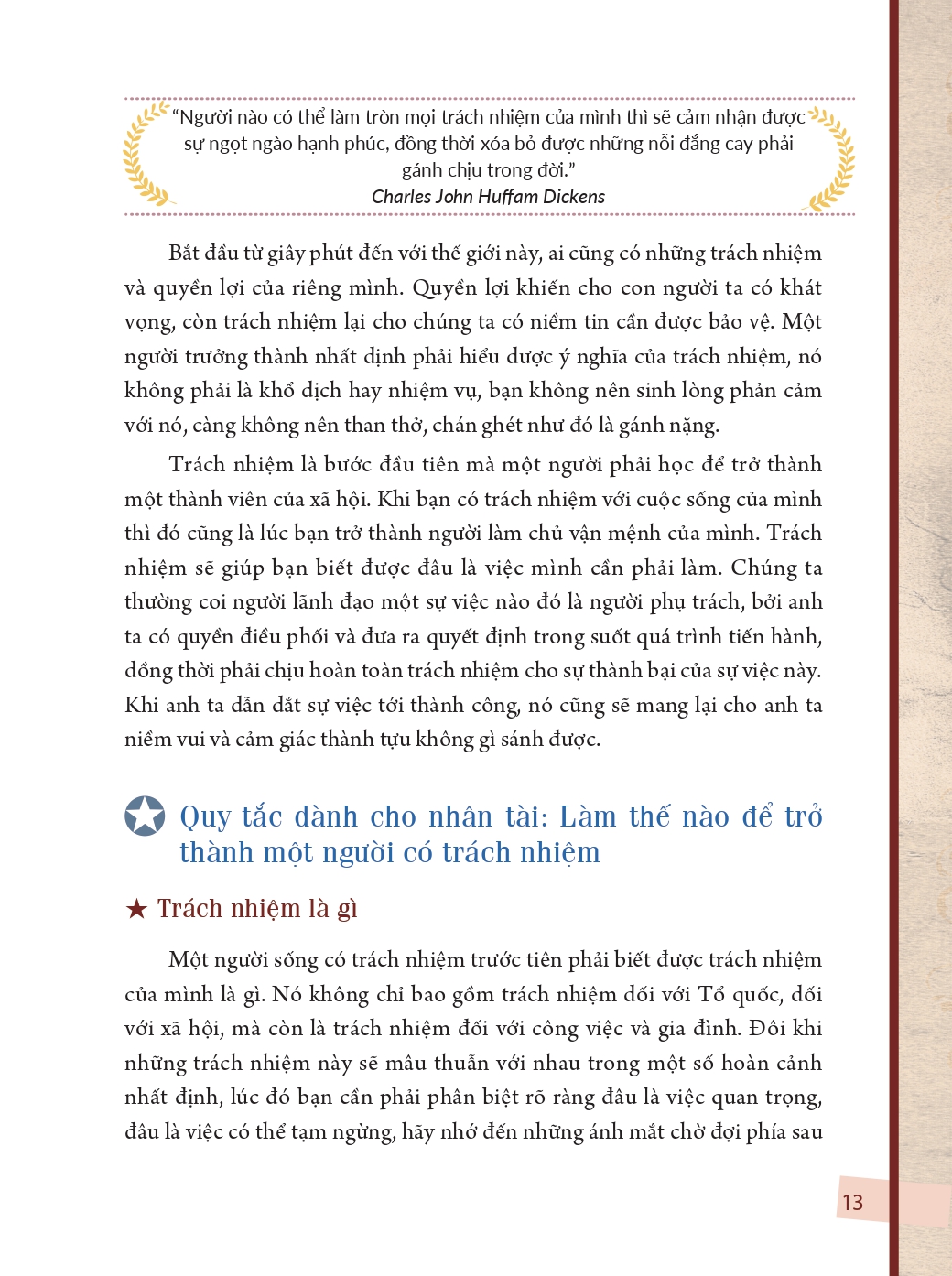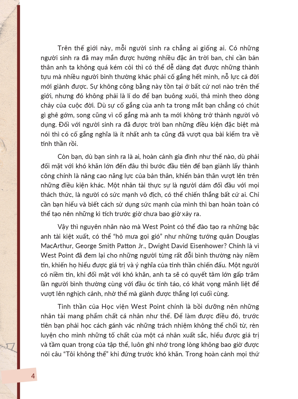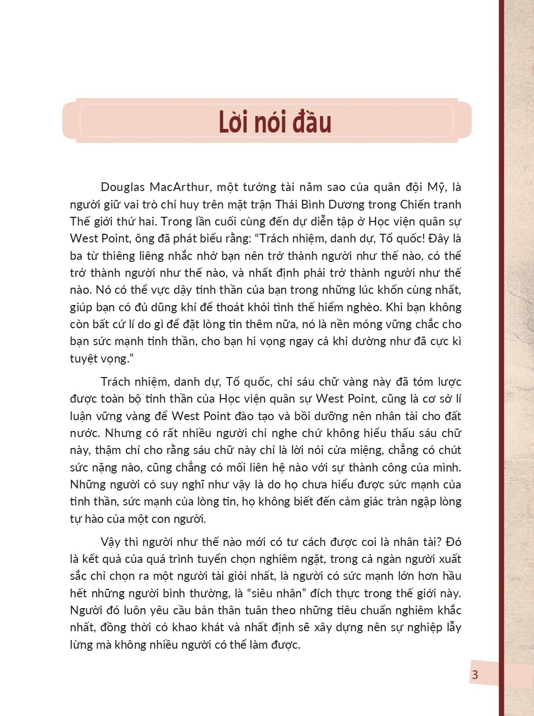 Cuốn sách này sẽ hệ thống lại những quy tắc, biện pháp mà Học viện quân sự West Point đã áp dụng để đào tạo và bồi dưỡng nên những nhân tài kiệt xuất. Phía sau mỗi quy tắc lại là một câu chuyện về thành công. Nếu bạn muốn trong cuộc đời hữu hạn của mình có thể tạo nên những thành tựu rực rỡ, thậm chí được ghi tên mình vào lịch sử, bạn nhất định phải biết và hiểu những quy tắc này. Chúng sẽ là những lò xo trợ lực cho bạn trên con đường đến với thành công, giúp bạn vượt qua mọi nghịch cảnh để giành lấy chiến thắng cuối cùng.