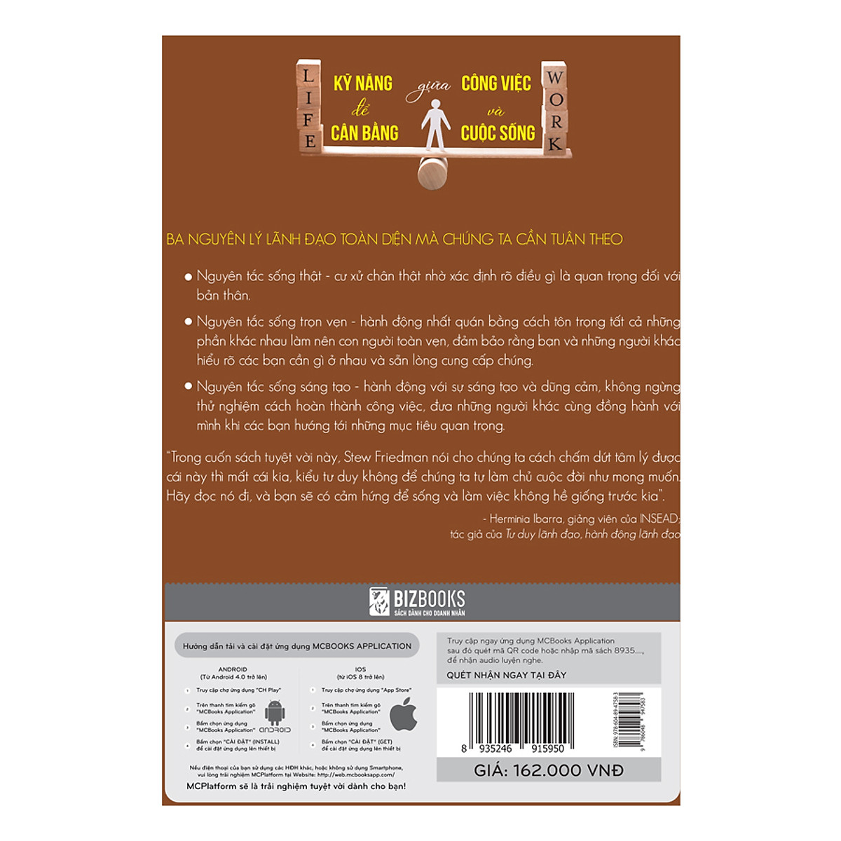 - Nguyên tắc sống sáng tạo, không ngừng thử nghiệm cách hoàn thành công việc, đưa người khác cùng đồng hành với mình khi các bạn có chung những mục tiêu quan trọng. Ngoài ra, trong cuốn sách này bạn sẽ học được cách chấm dứt tâm lý được cái này, mất cái kia, kiểu tư duy không để chúng ta tự làm chủ cuộc đời như mong muốn. Hãy đọc nó và bạn sẽ có cảm hứng để sống và làm việc không hề giống như trước kia. Kỹ năng để cân bằng giữa công việc và cuộc sống Công việc và cuộc sống là hai bản thể tồn tại song song với nhau hàng ngày của bạn phải không? Khi mà chúng ta ngày càng bận rộn hơn với công việc thì cũng kèm theo đó là chuỗi ngày căng thẳng mà đến dây thần kinh cũng muốn đứt. Nếu như thời điểm trước đây, chúng ta làm việc 8h/ngày và trở về nhà nghỉ ngơi thì giờ đây mọi người thường xuyên mang việc về nhà. Họ liên tục kiểm tra công việc thông qua điện thoại di động ở nhà (ngay cả khi đó là thời gian cho bữa tối) và đọc báo cáo công việc vào tối muộn. Làm việc với lịch và cường độ như vậy sẽ gây tổn hại đến sức khỏe của mọi người. Đã đến lúc mọi người cần quan tâm đến bản thân mình nhiều hơn và tìm cách cân bằng giữa công việc và cuộc sống gia đình. Bạn đã bao giờ nghĩ đến một cách nào đó để mình có thể cân bằng mọi thứ, ít nhất là công việc và cuộc sống để mình có dư giả chút thời gian bên con lâu hơn, bên gia đình lâu hơn hay thời gian cho chính bản thân mình thêm chút nữa. Nhiều cuốn sách phát triển cá nhân gợi ý rằng bạn nên kết hợp thời gian làm việc và giải trí để giảm bớt căng thẳng. Tuy nhiên, trong thực tế việc này không hề dễ dàng. Để cân bằngtốt giữa thời gian cho công việc, gia đình, bạn bè và bản thân bạn cần có những kỹ năng quản lý căng thẳng. Hãy suy nghĩ nghiêm túc về việc cân bằng cuộc sống cho dù bạn đang gặp phải áp lực từ gia đình hay các vấn đề liên quan đến công việc. Lý do bạn mất cân bằng giữa công việc và cuộc sống? Có rất nhiều lý do mà tôi thu thập được từ rất nhiều cá nhân khi phỏng vấn trực tiếp họ cái lý do mà họ thấy mọi thứ đang không còn cân bằng kể từ ngày họ đi làm. Một trong số đó: