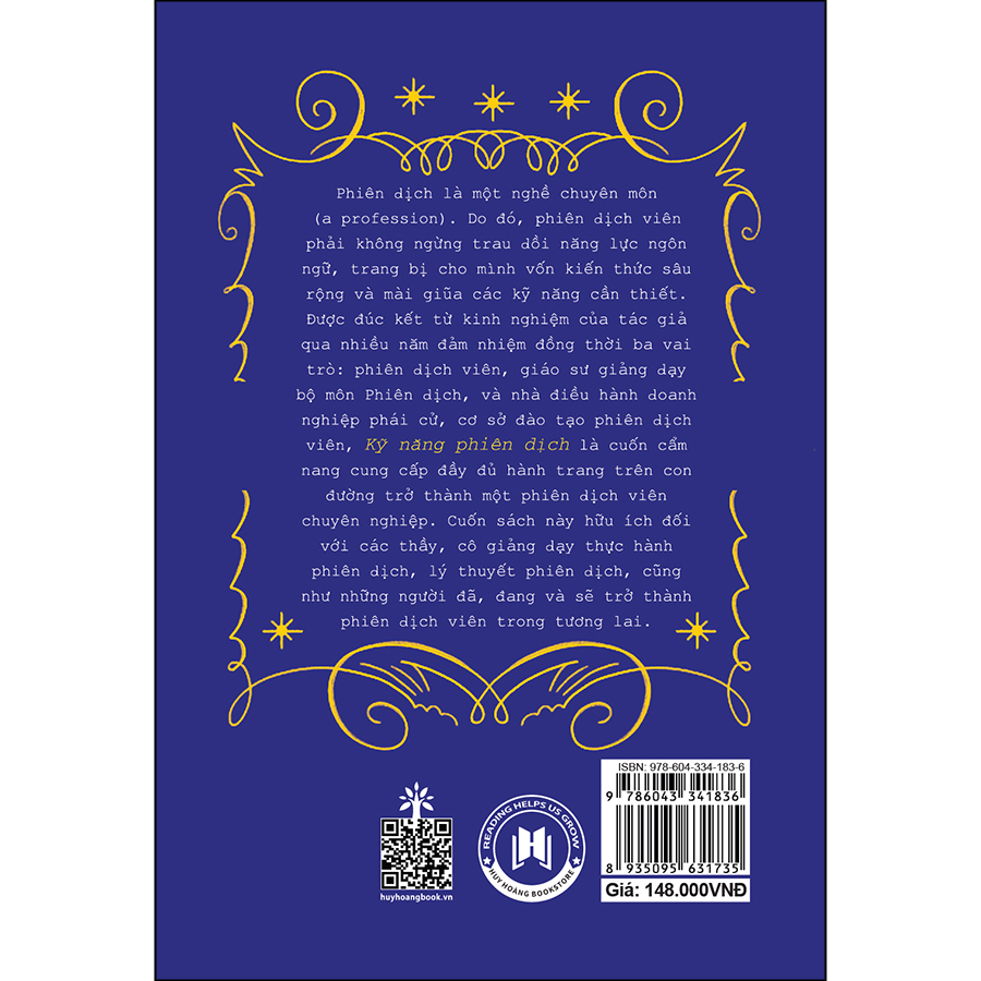 Mua tại TiktokPhiên dịch là một nghề chuyên môn (a profession). Do đó, phiên dịch viên phải không ngừng trau dồi năng lực ngôn ngữ, trang bị cho mình vốn kiến thức sâu rộng và mài giũa các kỹ năng cần thiết. Được đúc kết từ kinh nghiệm của tác giả qua nhiều năm đảm nhiệm đồng thời ba vai trò: phiên dịch viên, giáo sư giảng dạy bộ môn Phiên dịch, và nhà điều hành doanh nghiệp phái cử, cơ sở đào tạo phiên dịch viên, Kỹ năng phiên dịch là cuốn cẩm nang cung cấp đầy đủ hành trang trên con đường trở thành một phiên dịch viên chuyên nghiệp. Cuốn sách này hữu ích đối với các thầy, cô giảng dạy thực hành phiên dịch, lý thuyết phiên dịch, cũng như những người đã, đang và sẽ trở thành phiên dịch viên trong tương lai.