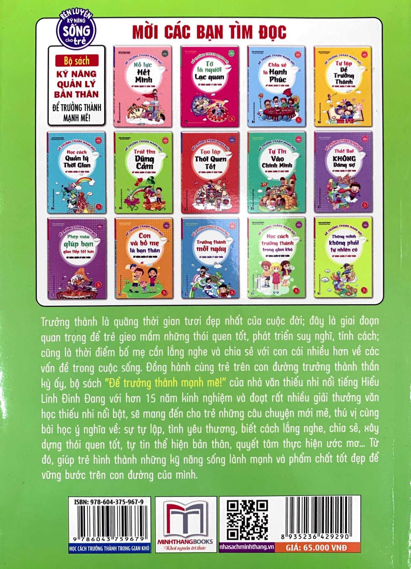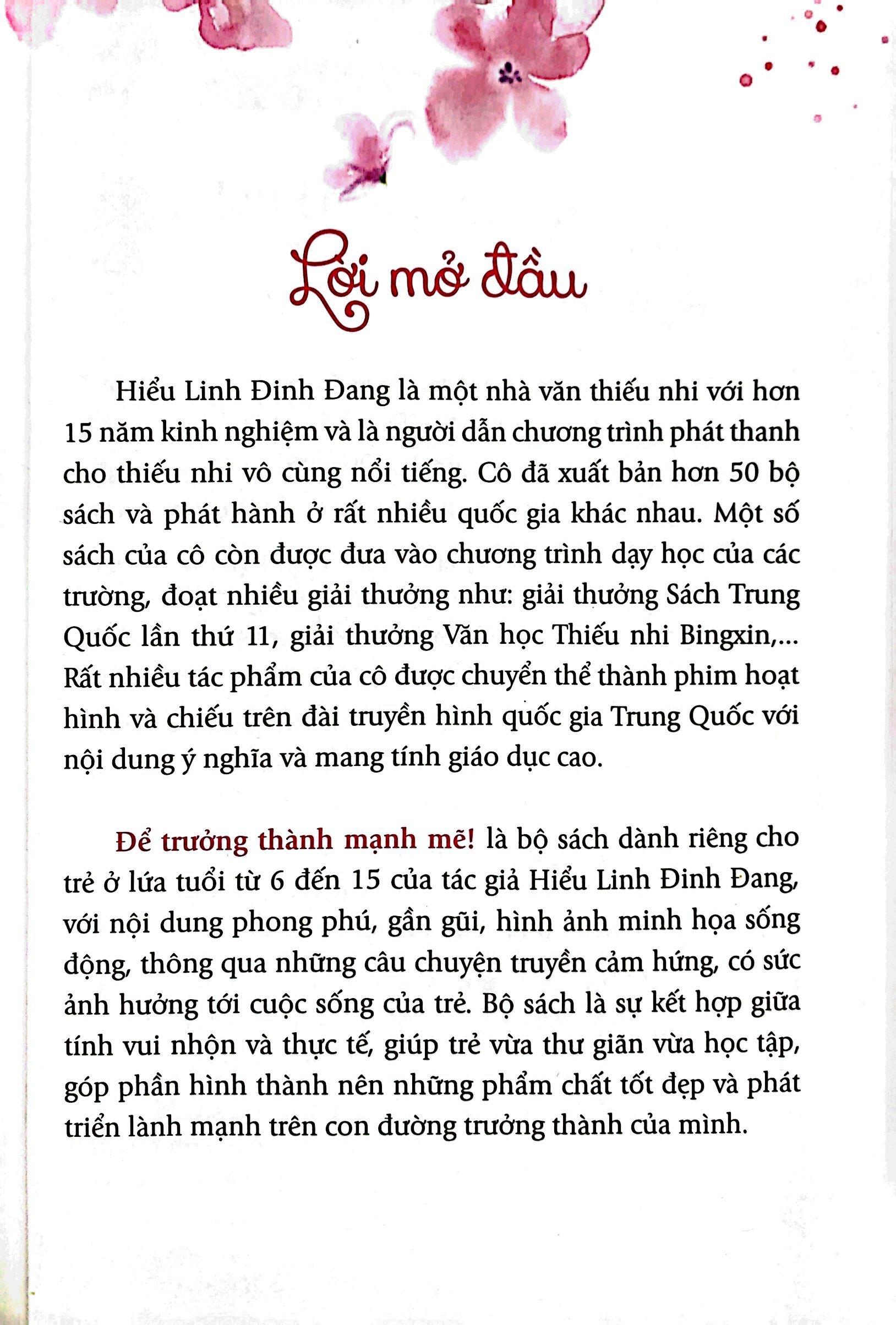 Trưởng thành là quãng thời gian tươi đẹp nhất của cuộc đời , đây là giai đoạn quan trọng để trẻ gieo mầm những thói quen tốt , phát triển suy nghĩ , tính cách ; cũng là thời điểm bố mẹ cần lắng nghe và chia sẻ với con cái nhiều hơn về các vấn đề trong cuộc sống . Đồng hành cùng trẻ trên con đường trưởng thành thần kỳ ấy , bộ sách "Để trường thành mạnh mẽ!" của nhà văn thiếu nhi nổi tiếng Hiểu Linh Đinh Đang với hơn 15 năm kinh nghiệm và đoạt rất nhiều giải thưởng văn học thiếu nhi nổi bật , sẽ mang đến cho trẻ những câu chuyện mới mẻ , thú vị cùng bài học ý nghĩa về : sự tự lập , tình yêu thương , biết cách lắng nghe , chia sẻ , Từ đó , giúp trẻ hình thành những kỹ năng sống lành mạnh và phẩm chất tốt đẹp để vững bước trên con đường của mình .