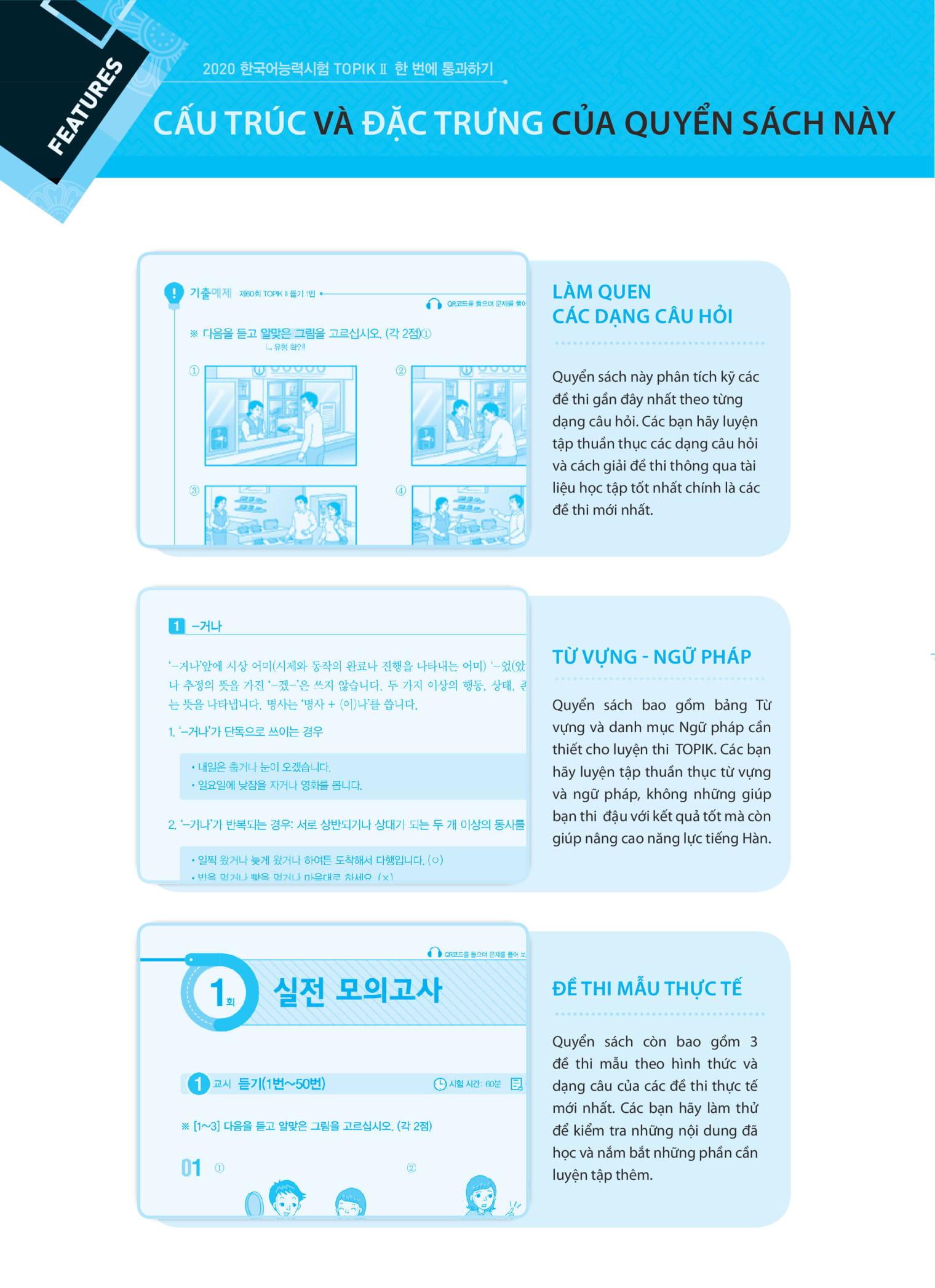 “TOPIK II - Thi là đậu” là giáo trình cập nhật mới nhất về kỳ thi và các dạng đề TOPIK II. Giáo trình cũng đáp ứng đầy đủ nhất yêu cầu của người muốn