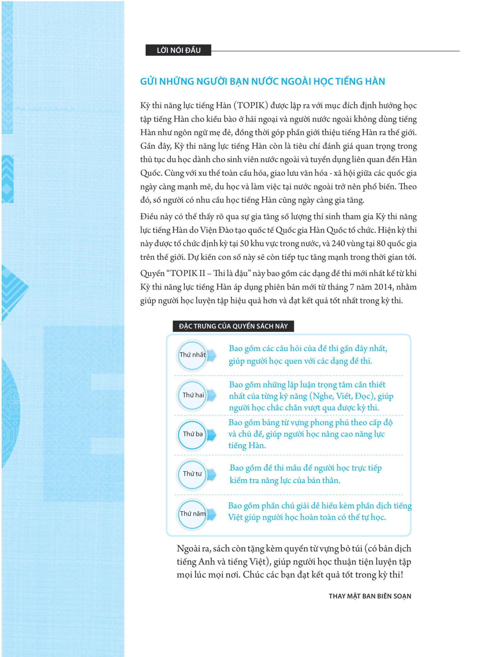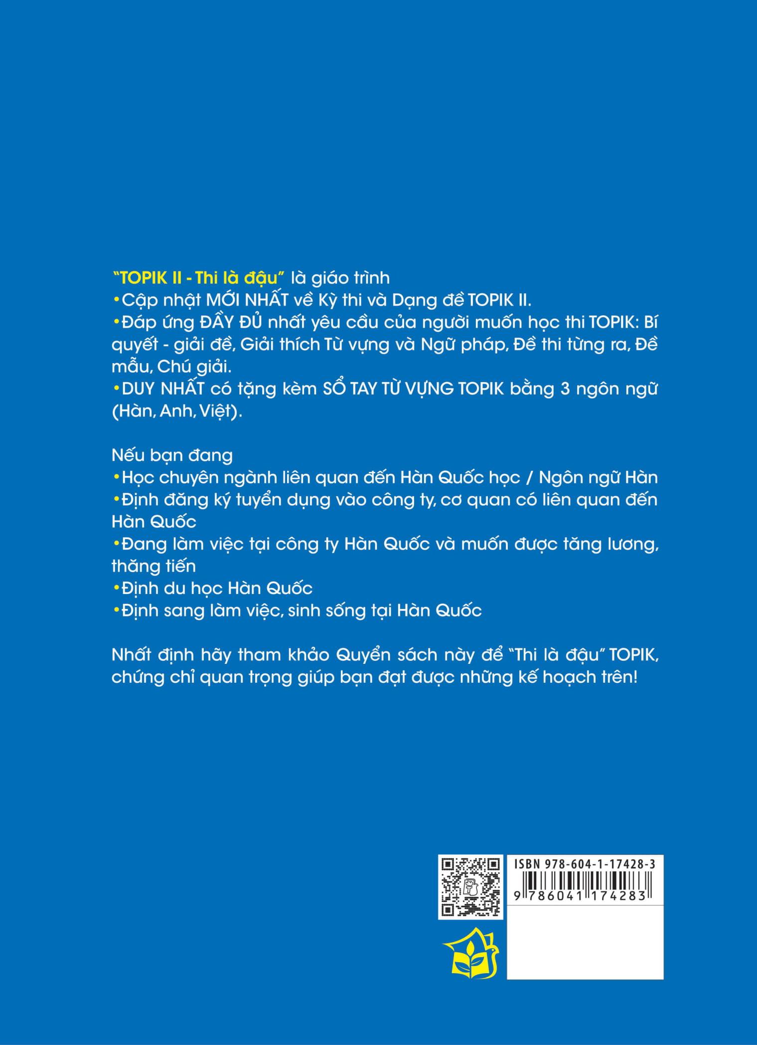“TOPIK II - Thi là đậu” là giáo trình cập nhật mới nhất về kỳ thi và các dạng đề TOPIK II. Giáo trình cũng đáp ứng đầy đủ nhất yêu cầu của người muốn học thi TOPIK, với những nội dung “Bí quyết giải đề”, “Giải thích Từ vựng và Ngữ pháp”, “Đề thi từng ra”, “Đề mẫu”, và “Chú giải”. Ngoài ra còn có “Sổ tay từ vựng” TOPIK với 3 ngôn ngữ Hàn, Anh, Việt chỉ có duy nhất trong giáo trình này. “TOPIK II - Thi là đậu” là giáo trình không thể thiếu dành cho các đối tượng đang: