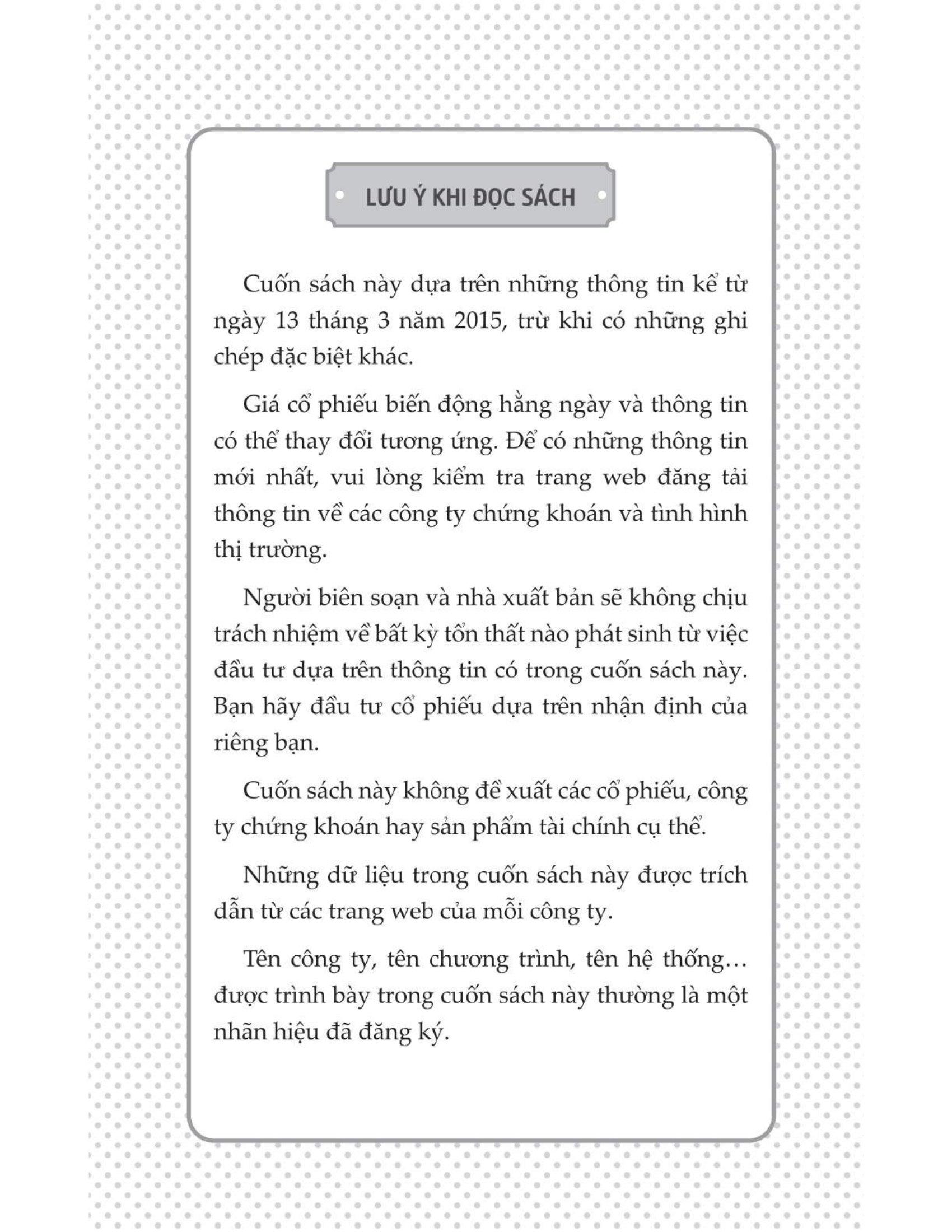 Cuốn sách giải thích mọi thứ - từ những điều cơ bản về lựa chọn tài khoản, lựa chọn mã cổ phiếu phù hợp đến những điểm then chốt khi tiến hành phân tích thị trường. Bạn sẽ được hướng dẫn về ý nghĩa của các chỉ số quan trọng, cách thực hiện phân tích cơ bản, phân tích kỹ thuật, đọc đồ thị hình nến… để tiến hành mua và bán cổ phiếu một cách kịp thời và hiệu quả, nhằm tối ưu lợi nhuận cũng như hạn chế tối đa các rủi ro trên thị trường.