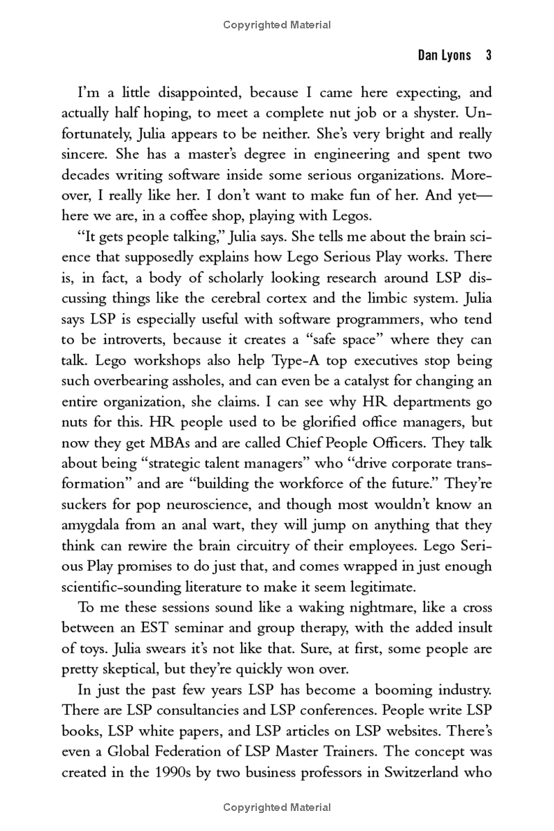 For two years, Lyons ventured in search of answers. From the innovation-crazed headquarters of the Ford Motor Company in Detroit, to a cult-like "Holocracy" workshop in San Francisco, and to corporate trainers who specialize in . . . Legos, Lyons immersed himself in the often half-baked and frequently lucrative world of what passes for management science today. He shows how new tools, workplace practices, and business models championed by tech's empathy-impaired power brokers have shattered the social contract that once existed between companies and their employees. These dystopian beliefs--often masked by pithy slogans like "We're a Team, Not a Family" -- have dire consequences: millions of workers who are subject to constant change, dehumanizing technologies -- even health risks.
