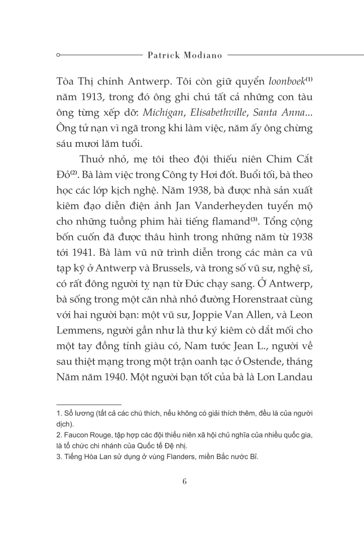 Patrick Modiano, sinh năm 1945 tại Pháp, có cha là người Ý gốc Do Thái, mẹ là nghệ sĩ người Bỉ. Patrick Modiano được coi là một trong những nhà văn tài năng nhất thế hệ của ông. Là nhà thám hiểm quá khứ, ông biết cách khơi gợi lên một cách vô cùng chính xác và chi tiết bầu không khí của những địa điểm hay những thời đại đã qua, ví dụ như Paris thời bị Đức chiếm đóng.