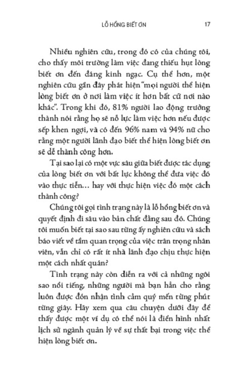 Người lao động muốn biết và cần biết công việc của mình có được trân trọng hay không. Bày tỏ lòng biết ơn đúng cách với nhân viên là phương thức đơn giản nhất, nhanh nhất, cũng như ít tốn kém nhất để tăng cường hiệu quả làm việc và giữ chân nhân viên lâu dài. Nhưng bằng cách nào, ngoài tiền thưởng và lời khen đôi khi có vẻ sao rỗng? "Lãnh Đạo Bằng Lòng Biết Ơn" sẽ gợi ý cho bạn. Quyển sách này đi sâu bàn luận một yếu tố tâm lý trong quản trị là lòng biết ơn và đưa ra những các thức đơn giản và thiết thực để phát huy yếu tố đó trong môi trường công sở hằng ngày nhằm thúc đẩy tinh thần, hiệu quả và lợi nhuận. Với giọng văn dễ hiểu, nhẹ nhàng và những ví dụ thiết thực, sau mỗi phần thực hành đều có phần tóm tắt để độc giả dễ nhớ và dễ theo dõi, quyển sách sẽ dẫn bạn qua từng phần, từ những hiểu lầm về cách thể hiện lòng biết ơn nơi công sở, đến những cách thức để áp dụng lòng biết ơn đến cách thể hiện lòng biết ơn cả trong đời sống cá nhân lẫn môi trường công sở.