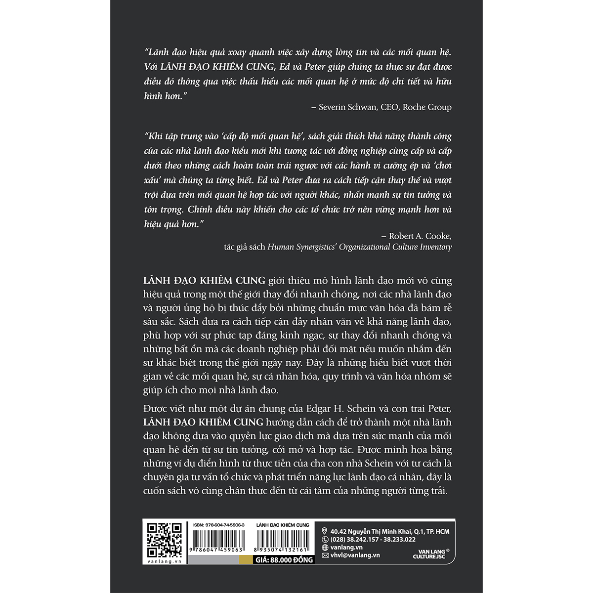 Được viết như một dự án chung của Edgar H. Schein và con trai Peter, Lãnh đạo Khiêm cung hướng dẫn cách để trở thành một nhà lãnh đạo không dựa vào quyền lực giao dịch mà dựa trên sức mạnh của mối quan hệ đến từ sự tin tưởng, cởi mở và hợp tác. Được minh họa bằng những ví dụ điển hình từ thực tiễn của cha con nhà Schein với tư cách là chuyên gia tư vấn tổ chức và phát triển năng lực lãnh đạo cá nhân, đây là cuốn sách vô cùng chân thực đến từ cái tâm của những người từng trải.