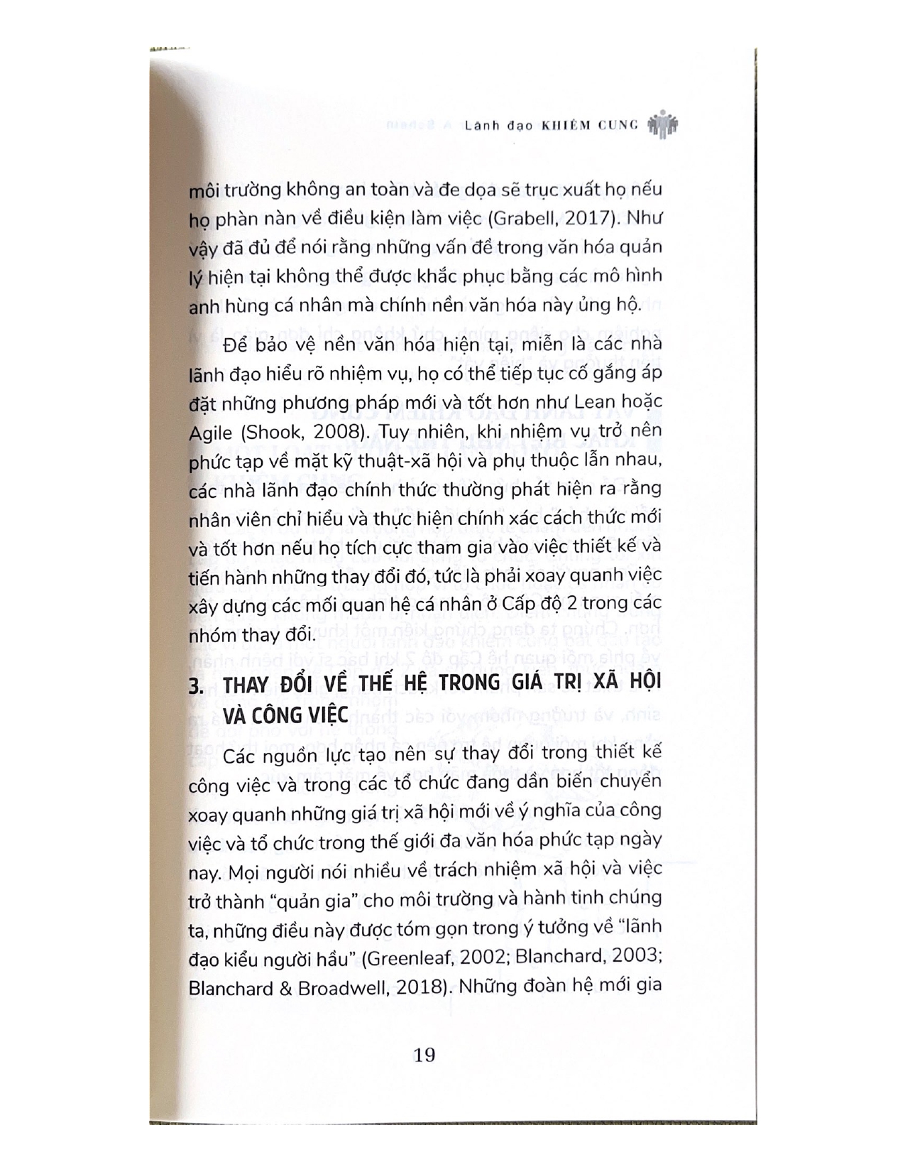 Được viết như một dự án chung của Edgar H. Schein và con trai Peter, Lãnh Đạo Khiêm Cung hướng dẫn cách để trở thành một nhà lãnh đạo không dựa vào quyền lực giao dịch mà dựa trên sức mạnh của mối quan hệ đến từ sự tin tưởng, cởi mở và hợp tác. Được minh họa bằng những ví dụ điển hình từ thực tiễn của cha con nhà Schein với tư cách là chuyên gia tư vấn tổ chức và phát triển năng lực lãnh đạo cá nhân, đây là cuốn sách vô cùng chân thực đến từ cái tâm của những người từng trải.