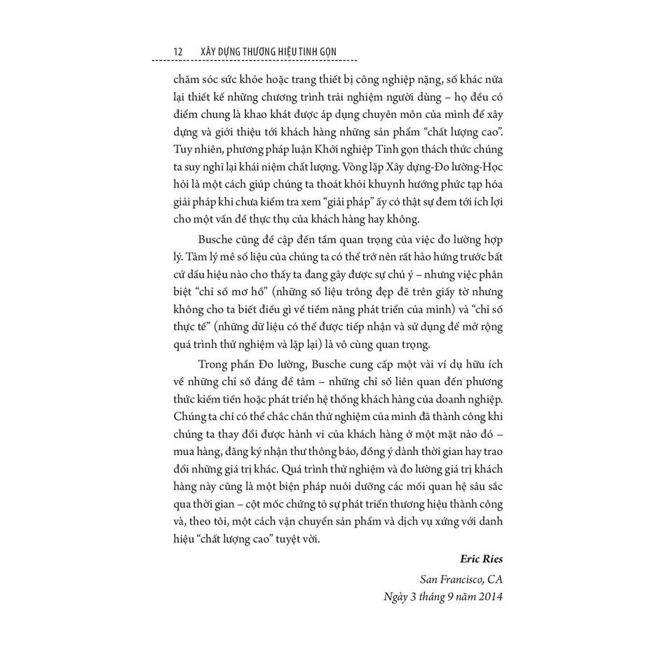 Trong phần Đo lường, Busche cung cấp một vài ví dụ hữu ích về những chỉ số đáng để tâm – những chỉ số liên quan đến phương thức kiếm tiền hoặc phát triển hệ thống khách hàng của doanh nghiệp. Chúng ta chỉ có thể chắc chắn rằng thử nghiệm của mình đã thành công khi chúng ta thay đổi được hành vi của khách hàng ở một mặt nào đó – mua hàng, đăng ký nhận thư thông báo, đồng ý dành thời gian hay trao đổi những giá trị khác. Quá trình thử nghiệm và đo lường giá trị khách hàng này cũng là một biện pháp nuôi dưỡng các mối quan hệ sâu sắc qua thời gian – cột mốc chứng tỏ sự phát triển thương hiệu thành công và, theo tôi, một cách vận chuyển sản phẩm và dịch vụ xứng với danh hiệu “chất lượng cao” tuyệt vời.