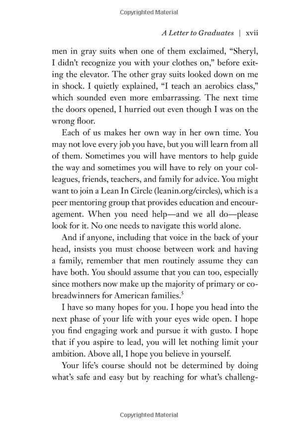 Expanded and updated exclusively for graduates just entering the workforce, this extraordinary edition of Lean In includes a letter to graduates from Sheryl Sandberg and six additional chapters from experts offering advice on finding and getting the most out of a first job; résumé writing; best interviewing practices; negotiating your salary; listening to your inner voice; owning who you are; and leaning in for millennial men. In 2013, Sheryl Sandberg’s Lean In became a massive cultural phenomenon and its title became an instant catchphrase for empowering women. The book soared to the top of best-seller lists both nationally and internationally, igniting global conversations about women and ambition. Sandberg packed theaters, dominated op-ed pages, appeared on every major television show and on the cover of Time magazine, and sparked ferocious debate about women and leadership. Now, this enhanced edition provides the entire text of the original book updated with more recent statistics and features a passionate letter from Sandberg encouraging graduates to find and commit to work they love. A combination of inspiration and practical advice, this new edition will speak directly to graduates and, like the original, will change lives. New Material for the Graduate Edition: · A Letter to Graduates from Sheryl Sandberg · Find Your First Job, by Mindy Levy (Levy has more than twenty years of experience in all phases of organizational management and holds degrees from Wharton and Penn) · Negotiate Your Salary, by Kim Keating (Keating is the founder and managing director of Keating Advisors) · Man Up: Millennial Men and Equality, by Kunal Modi (Modi is a consultant at McKinsey & Company and a recent graduate of Harvard Kennedy School and Harvard Business School) · Leaning In Together, by Rachel Thomas (Thomas is the president of Lean In) · Own Who You Are, by Mellody Hobson (Hobson is the president of Ariel Investments) · Listen to Your Inner Voice, by Rachel Simmons (Simmons is cofounder of the Girls Leadership Institute) · 12 Lean In stories (500-word essays), by readers around the world who have been inspired by Sandberg