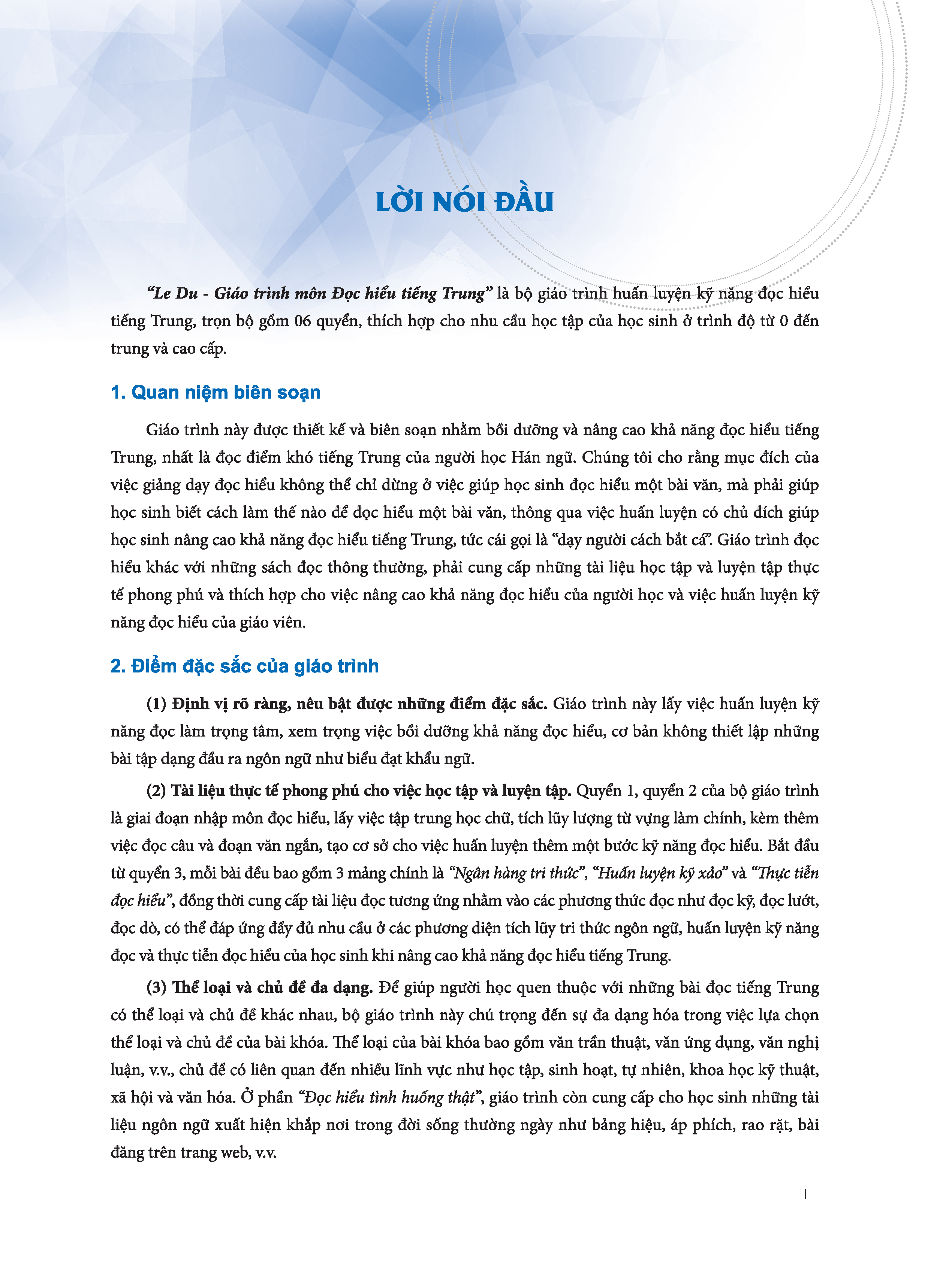 - Mục tiêu giảng dạy và đối tượng thích hợp sử dụng “Le Du - Giáo trình môn Đọc hiểu tiếng Trung, quyển 1” là giáo trình đọc  hiểu cấp nhập môn. Mục tiêu giảng