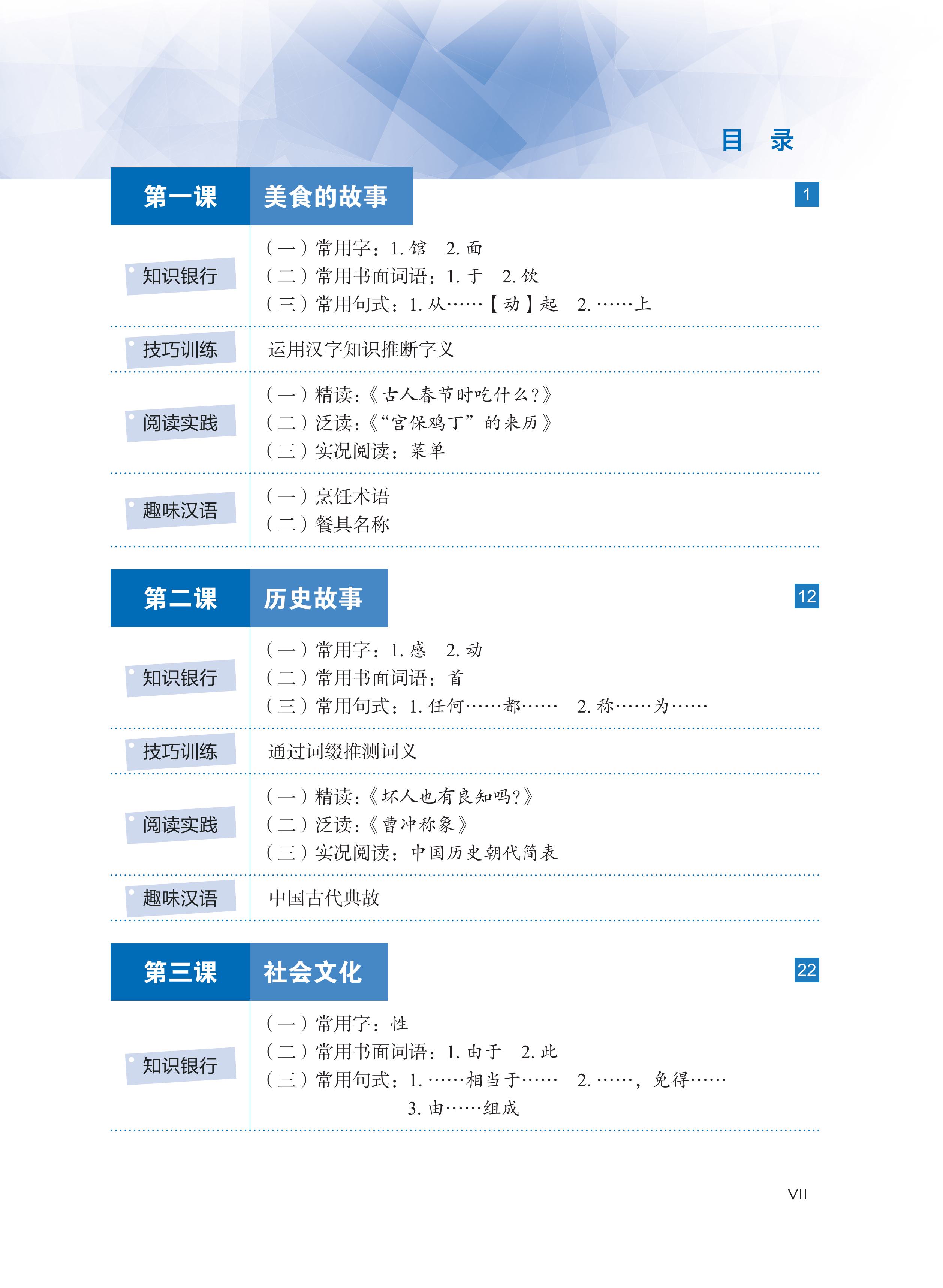 Phần 3: Thực tiễn đọc hiểu. Bao gồm ba phần lớn là đọc chuyên sâu, đọc mở rộng và đọc thực tế. Phần “Đọc chuyên sâu” và “Đọc mở rộng” bao gồm các nội dung như: học tập các từ vựng trọng tâm và từ vựng mở rộng thuộc các chủ đề thường gặp, bài tập khởi động, bài tập lý giải nội dung bài khóa, lý giải nghĩa câu và lý giải nghĩa từ, v.v., đồng thời trên cơ sở này hướng dẫn người học nắm được ý chính của bài khóa, vận dụng từ vựng trọng tâm thuộc chủ đề bài khóa để trình bày quan điểm, giới thiệu nội dung có liên quan một cách ngắn gọn. Phần “Đọc thực tế” bao gồm hai loại: Loại thứ nhất - “Đọc văn thuyết minh”, giúp người học tích lũy thường thức về lịch sử, văn hóa cần có đồng thời được tiếp xúc rộng rãi trong học tập và sinh hoạt thường ngày; loại thứ hai - “Tra tìm thông tin”, như tra tìm các thông tin du lịch, bảng giờ tàu xe, bảng các triều đại lịch sử, v.v., việc thiết kế nhiệm vụ nhấn mạnh tính ứng dụng, mục đích nhằm giúp người học giải quyết các vấn đề thường gặp trong học tập và sinh hoạt thường ngày.