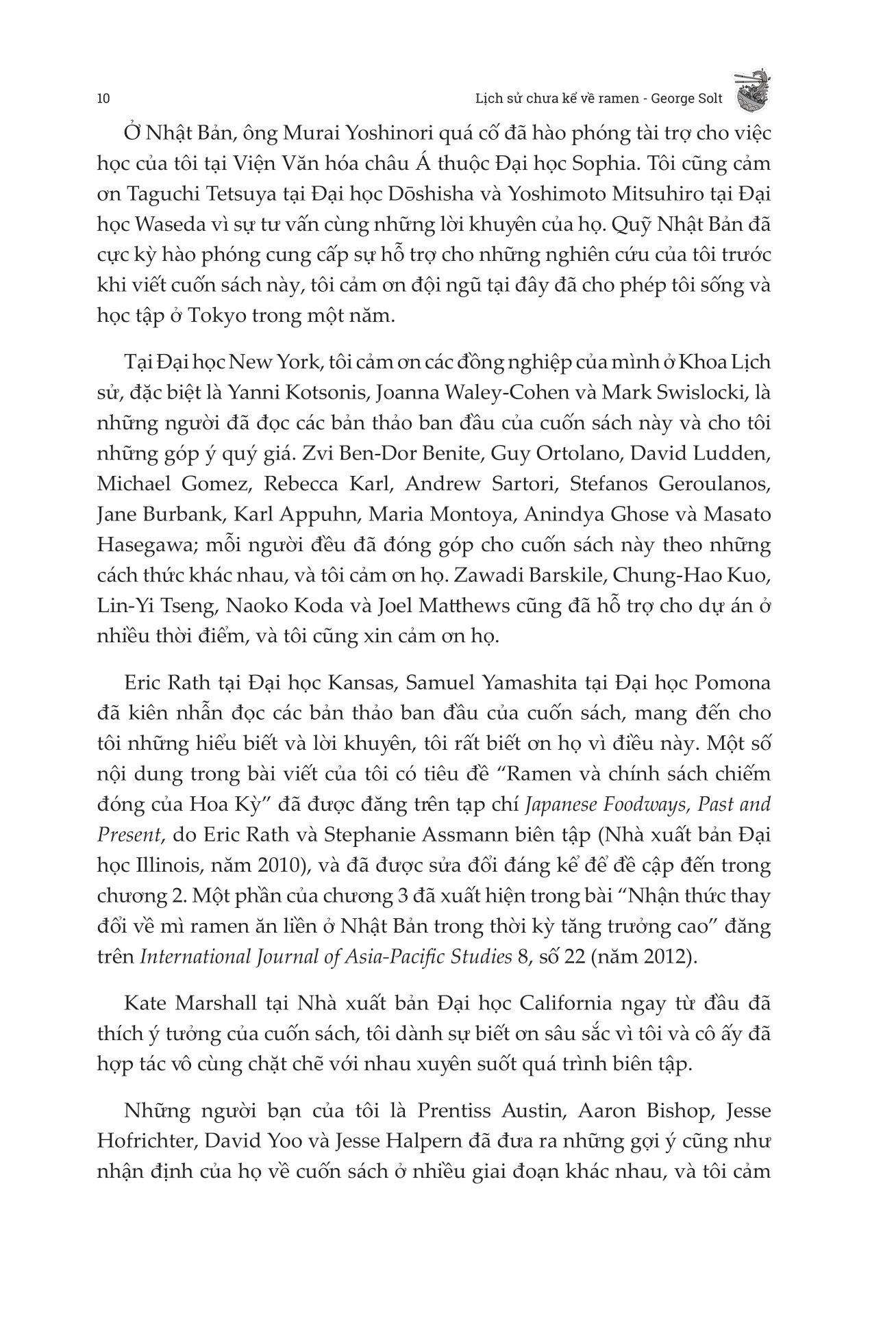 Vượt ra khỏi những bát nước dùng và sợi mì thơm ngon, George Solt đã kể lại cuộc hành trình biến đổi của mì ramen từ nguồn gốc khiêm tốn ở Trung Quốc cho đến một thương hiệu toàn cầu đại diện cho ẩm thực Nhật Bản trong Lịch Sử Chưa Kể Về Ramen - Biến Động Chính Trị Tại Nhật Bản Đã Tạo Ra Một Kỳ Tích Ẩm Thực Toàn Cầu Như Thế Nào?. Đây không chỉ là lịch sử của một món ăn được yêu thích, cuốn sách phản ánh quá trình tái thiết sau chiến tranh của Nhật Bản, những điều kỳ diệu về kinh tế và nhịp đập của xã hội Nhật Bản. George Solt đã mang đến một hành trình toàn diện và khai sáng vào thế giới ramen, giúp độc giả đánh giá lại món mì nổi tiếng với một sự tôn trọng mới dành cho lịch sử phong phú của nó.