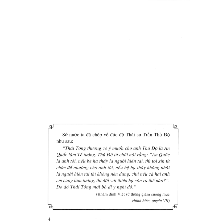 - "Dù là vua đầu tiên của một triều đại, nhưng Trần Cảnh không có miếu hiệu là Thái Tổ mà là Thái Tông. Lý do vì cha ruột của vua là Trần Thừa vẫn còn sống và làm quan trong triều với chức Phụ quốc Thái úy. Sau khi Trần Cảnh lên làm vua, Trần Thừa được tôn làm Thượng hoàng. Vì vua Trần chỉ mới tám tuổi nên không thể định đoạt được chính sự. Bởi vậy, mọi quyền hành đều nằm trong tay Trần Thừa và nhất là Thái sư Trần Thủ Độ. ..."