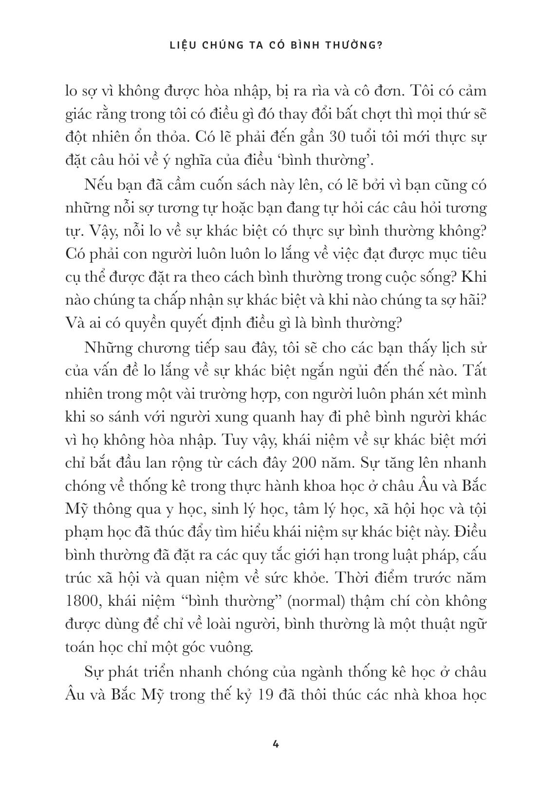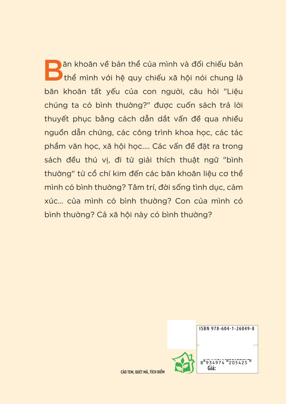 Các vấn đề đặt ra trong sách đều thú vị, đi từ giải thích thuật ngữ "bình thường" từ cổ chí kim đến các băn khoăn liệu cơ thể m.ình có bình thường? Tâm trí, đời sống tình dục, cảm xúc... của m.ình có bình thường chăng? Con của m.ình có bình thường, có giống hay bằng “con nhà người ta” không? Cả xã hội này có bình thường?