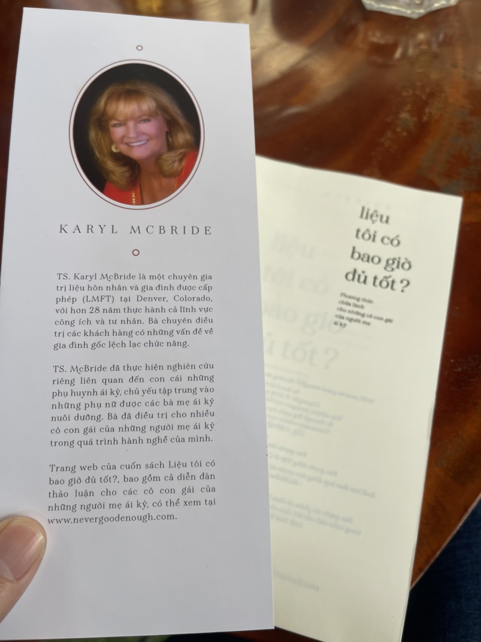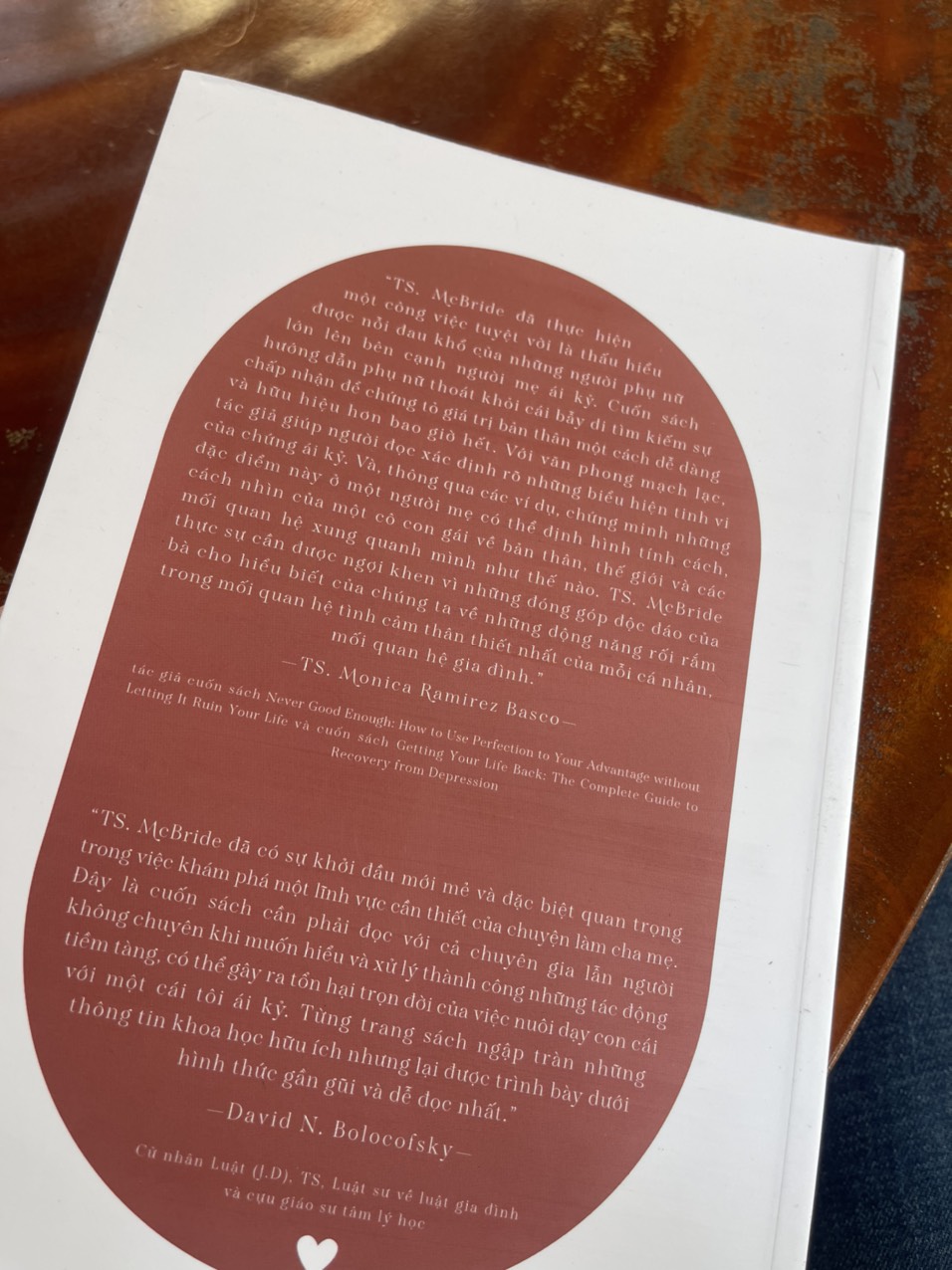 Đề tài tâm lý gia đình nóng lên chăng? Tôi liên tục nhận đầu sách về mảng này. Lần này là vấn để “chữa lành cho những cô con gái của người mẹ ái kỷ”. “TS. McBride thực hiện một nhiệm vụ tuyệt vời là mô tả đa diện về thói ái kỷ. Tôi thấy cuốn sách cực kỳ cuốn hút, dễ đọc, nhưng cũng rất giàu thông tin, thực tế, và có hệ thống trong phương hướng để tiếp cận và điều trị. Đây là một cuốn sách phải đọc cho bất kỳ ai đang sống với người yêu thương mắc chứng ái kỷ.” --Renee Richker Bác sĩ Y khoa, chuyên gia điều trị tâm lý cho trẻ em và trẻ vị thành niên. “TS. McBride đã thực hiện một công việc tuyệt vời là thấu hiểu được nỗi đau khổ của những người phụ nữ lớn lên bên cạnh người mẹ ái kỷ. Cuốn sách hướng dẫn phụ nữ thoát khỏi cái bẫy đi tìm kiếm sự chấp nhận để chứng tỏ giá trị bản thân một cách dễ dàng và hữu hiệu hơn bao giờ hết. Với văn phòng mạch lạc, tác giả giúp người đọc xác định rõ những biểu hiện tinh vi của chứng ái kỷ. Và, thông qua các ví dụ, chứng minh những đặc điểm này ở một người mẹ có thể định hình tính cách, cách nhìn của một cô con gái về bản thân, thế giới và các mối quan hệ xung quanh mình như thế nào. TS. McBride thực sự cần được ngợi khen vì những đóng góp độc đáo của bà cho hiểu biết của chúng ta về những động năng rối rắm trong mối quan hệ tình cảm thân thiết nhất của mỗi cá nhân,mối quan hệ gia đình.” -TS. Monica Ramirez Basco tác giả cuốn sách Never Good Enough: How to Use Perfection to Your Advantage without Letting It Ruin Your Life và cuốn sách Getting Your Life Back: The Complete Guide to Recovery from Depression