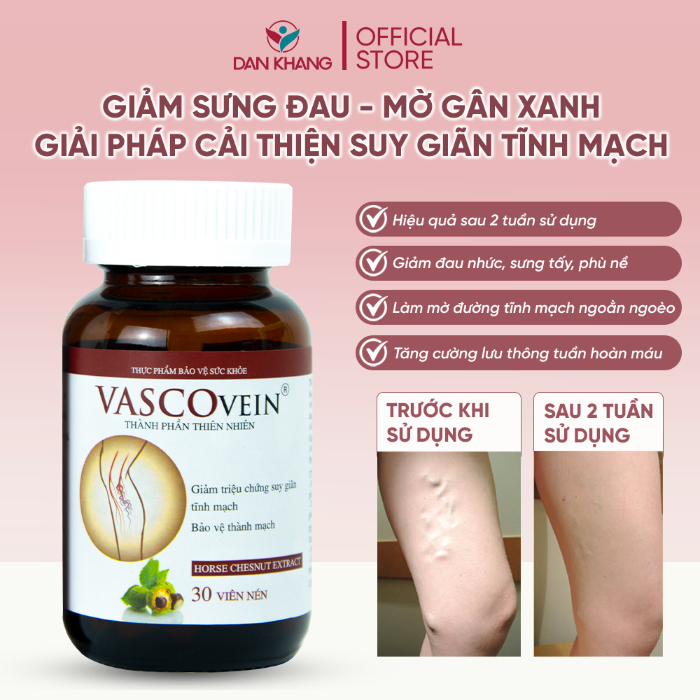 - VIÊN UỐNG HỖ TRỢ VÀ PHÒNG NGỪA SUY GIÃN TĨNH MẠCH VASCOVEIN Với sự kết hợp của các thành phần thiên nhiên như: chiết xuất Hạt dẻ ngựa, chiết xuất hoa Hòe, chiết xuất hạt Nho, Viên uống Vascovein giúp cung cấp các dưỡng chất làm tăng độ đàn hồi da và mạch máu, chống lão hóa, ngăn ngừa và cải thiện tình trạng suy giãn tĩnh mạch. Thành phần Viên uống Vascovein: