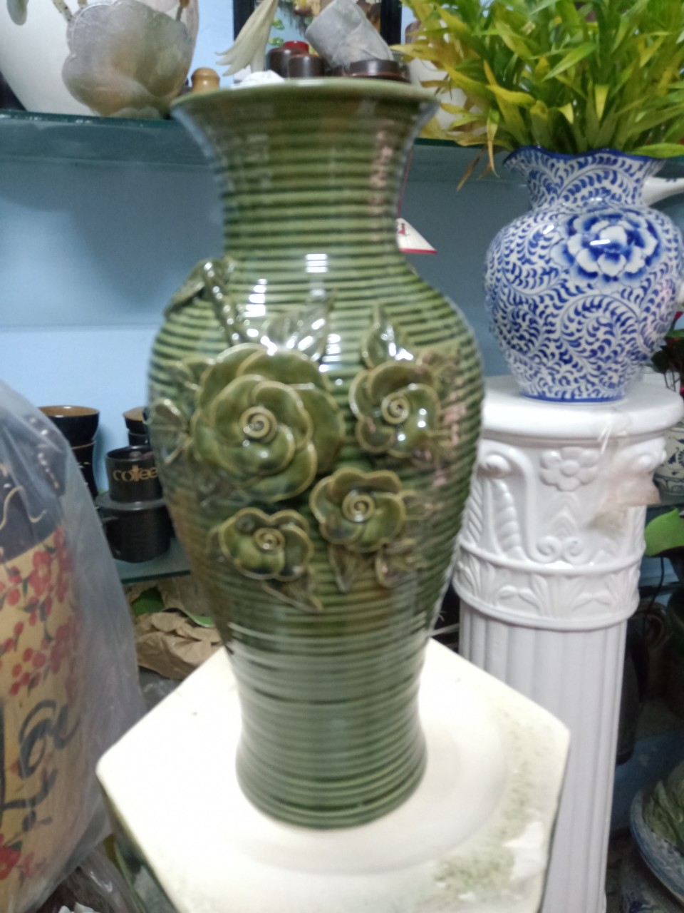 Lọ Lộc Bình Men Rạn Đắp Nổi được làm thủ công bởi bàn tay nghệ sĩ của những nghệ nhân làng gốm Bát Tràng Kích thước :Chiều cao 42cm Phù hợp với những ban thờ