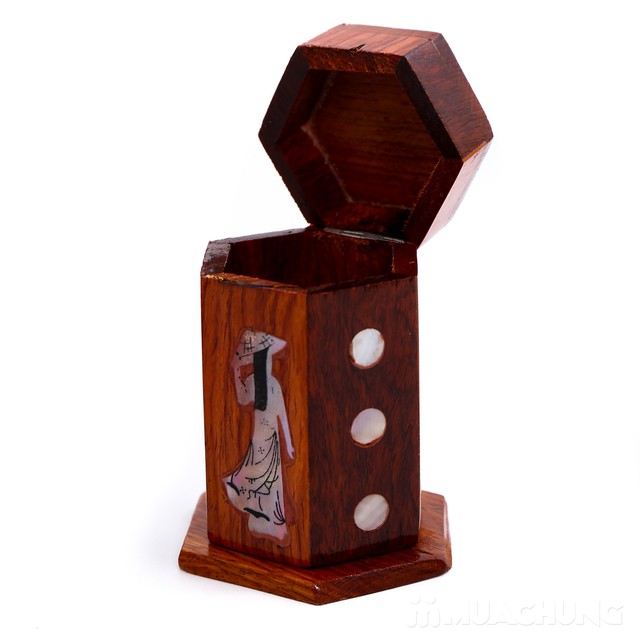 Thông tin sản phẩm Thiết kế tinh tế theo phong cách đồ gỗ mỹ nghệ khảm trai. - Ống đựng tăm có thể đóng mở, tiện lợi khi sử dụng. - Chất liệu gỗ bền