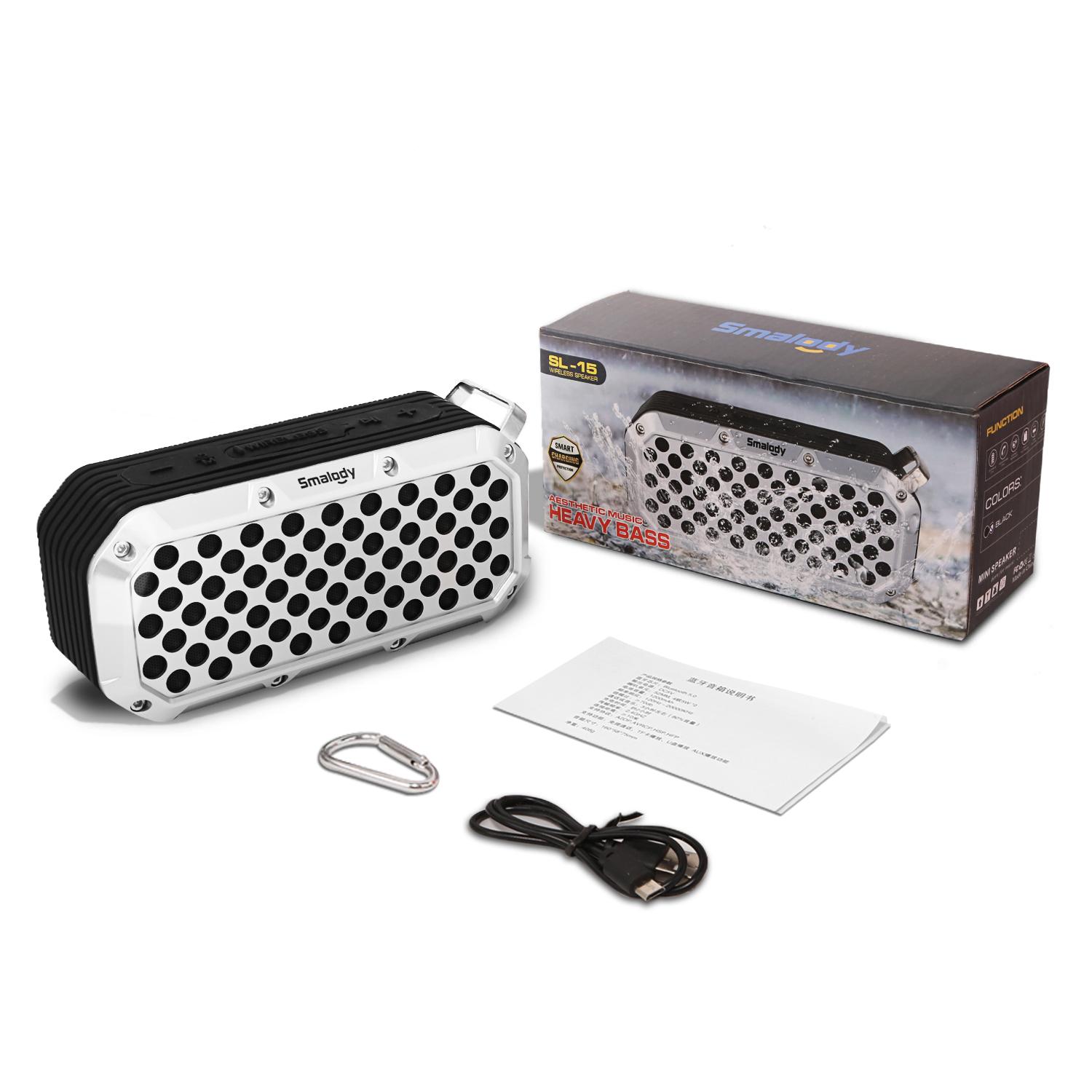 Overview: If you are finding a characteristic soundbar, this product is your dreaming item. The overall portable waterproof cool design makes this BT speaker unique, it would be a wonderful gift for your beloved ones. Features: High-Quality Crystal Clear Sound: Distinct mids and highs from our precision acoustic drivers deliver the excellent stereo sound and enhanced bass from our proprietary passive bass radiator design. Built-in 2 drivers of 5W portable speakerphone with crystal clear sound and strong bass without distortion even at the highest volume. Louder Volume and More Bass: The Crystal clear deep bass 10W HD loud speakers for both active outdoor and indoor use: room-filling sound, perfect for home, dorm room, kitchen, bathroom, car, parties. BT 5.0 Technology: Connect over BT is compatible with: Smartphone, Tablet PC, Laptop. To play from Computer and non-BT devices use the included 3.5mm audio cable connected to the AUX-IN jack --- Built-in MIC for handsfree speakerphone from Smartphones and iPhones. Waterproof Design: IPX6 rating speaker can resist gentle water spray splash but cannot be partially or fully submerged. Portable and Lightweight: The portable BT Speaker is with steel hook and very easily hang on a backpack or bicycle. Long Battery Life: Built-in 1200 mAh rechargeable Lithium Polymer battery. Only needs 2 hours to fully charge. Specifications: Brand: Smalody Model: SL-15 BT Version: BT V5.0 Speaker driver: 52mm Power: 5W 2 Charging time: around 2 hours Connection range: 33 feet Operating frequency: 120Hz-20KHZ Battery: Built-in rechargeable 3.7V 1200mAh lithium-ion battery Item Size: 16 5.8 6cm / 6.30 2.28 2.36in Item weight: 360g / 12.70oz Package Size: 18 6.3 8.1cm / 7.09 2.48 3.19in Package Weight: 410.5g / 14.48oz Package List: 1 BT speaker 1 User Manual 1 Steel Hook 1 * Micro USB Charging Cable