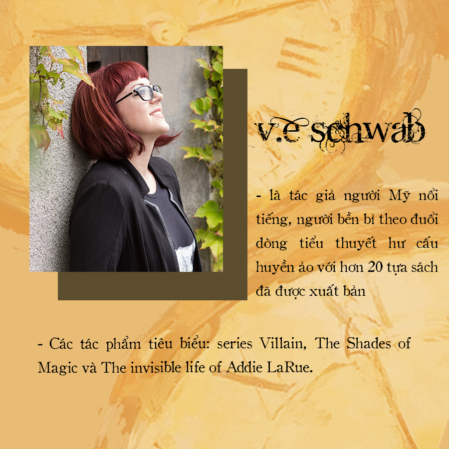 V.E Schwab là tác giả người Mỹ nổi tiếng, người bền bỉ theo đuổi dòng tiểu thuyết hư cấu huyền ảo với hơn 20 tựa sách đã được xuất bản tại Mỹ cũng như trên toàn thế giới. Các tác phẩm tiêu biểu của cô có thể kể đến series Villain, The Shades of Magic và tiểu thuyết độc lập The invisible life of Addie LaRue. Khi không lang thang trên những con phố Paris hay lê bước trên những sườn đồi của nước Anh, cô thường sống ở Edinburg, Scotland, thu mình trong góc một quán cà phê và mơ về những con quái vật.