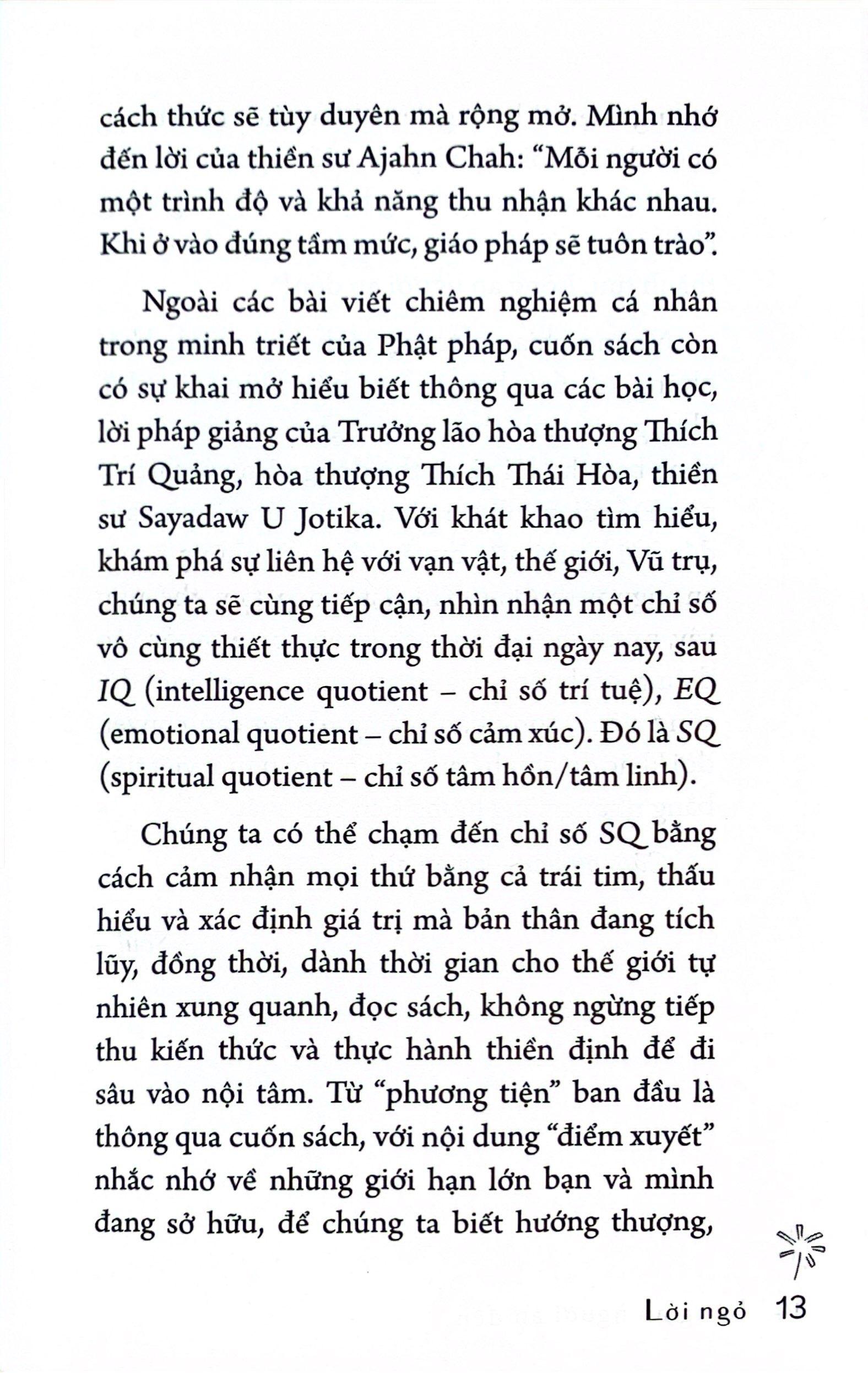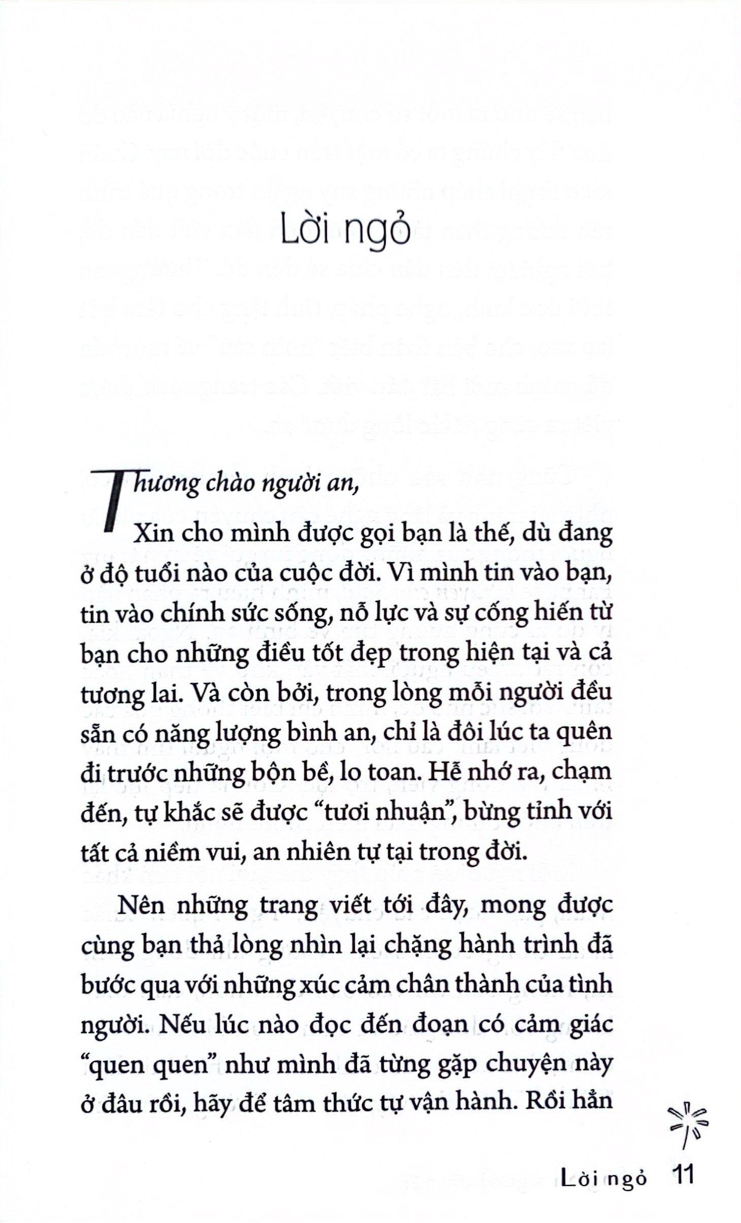 • Đúng hay sai, sau cùng đều là trưởng thành Trích dẫn sách: Trích đoạn 1: Làm người có chút “mẻ”, chút “sứt” mới hiểu được sự tròn khuyết của thế gian. Trầm m.ình tĩnh lặng trong gian khó, bĩ cực rồi mới có ngày thái lai. Khổ thì cũng khổ rồi, sợ khó khăn thì khó khăn cũng tới rồi. Nên những ai khi đó, trong suy nghĩ nhắc lòng phải tiến bước thì khúc ngoặt nào trong đời cũng sẽ “lội” qua được. Còn những ai bỏ cuộc chạy trốn, chắc chắn không thể vượt qua và nhìn thấy điều tốt đẹp phía sau khúc quanh đó. Qua cơn giông tố mới biết đâu là cây chắc rễ. Qua những lúc không bình lặng mới bật mạnh mẽ những tiềm năng vô tận. Trong mỗi người đều có “vật báu”, tùy bản lĩnh mà phát sáng lên dần. Trích đoạn 2: Mỗi người không chỉ có một mà có thể rất nhiều “trạm sạc” trong suốt cuộc đời, biểu hiện dưới nhiều phương pháp, phương tiện, cách thức khác nhau. Đôi khi cùng một “trạm” nhưng dòng cảm nhận, chuyển hóa năng lượng lại khác nhau tùy theo độ tuổi, chặng đường, sự thiếu đủ của mỗi người. Và điều hay nhất của những “trạm sạc” nằm ở việc, nó luôn lan tỏa năng lượng an lành một cách rất tự nhiên. Như những con người sống bình dị, yêu đời trong chính cách họ sống. Nó tự động truyền cảm hứng tốt đẹp đi muôn nơi mà không hề gượng ép hay khiên cưỡng. Biết đâu chính bạn lại đang là “trạm sạc” cho một người nào đó thông qua những điều bạn đang cống hiến tận tụy và dùng chính trái tim cảm nhận những nét đẹp của cuộc đời. Điều gì từ trái tim sẽ chạm đến trái tim! Chúng ta tương hỗ qua lại để động viên nhau như vậy cũng là đang nuôi dưỡng cho mầm thiện trong lòng. Khi tính thiện ngày càng lớn, ta sẽ có những quyết định sáng suốt, vì vậy, cuộc sống sẽ tốt hơn, phải không bạn? Trích đoạn 3: Nếu ta chết đi, trở về hư không, hóa hư vô, không có gì là của ta thì không đúng. Rõ ràng, trong cái không vẫn có cái của riêng ta như thế. Những giá trị vô hình: tỉnh thức, bình an, hạnh phúc tình ngườ giống như “sợi tơ vàng” để con người nương vào đó trở về lại nguồn cội. Dù ở tuổi đời nào, kiếp sống nào, hễ rời xa những điều trên, lập tức chúng ta lại cảm thấy lạc lõng, chới với. Nhưng có điều, dù chúng ta đến từ đâu, từ cảnh giới hay hành tinh nào ngoài Vũ trụ bao la, đã trải qua bao nhiêu kiếp sống đi chăng nữa, hễ đã có mặt ở Trái đất này, là đang cùng học và cùng trưởng thành, rất công bằng. Không vì có sứ mệnh, hay tiền kiếp lừng lẫy thế nào, từ thời không nào đến mà một người được ưu á Ai cũng phải trải qua bài học về “đoạn khổ, hướng sáng”. Trích đoạn 4: Tâm trạng và tính cách cũng được “dịch” sang ngôn ngữ cơ thể – cách đi đứng, ứng xử và giữ gìn bản thân nói lên rất nhiều về chúng ta là ai và chúng ta như thế nào. Tất cả đều thể hiện sinh động qua hình tướng bên ngoài. Khi một người giữ ý nghĩ sống không thẹn với lòng, với người, sống chính trực, dường như từ trên đầu, trong tim và lan ra khắp cơ thể sẽ có một nguồn sáng vô hình rất đẹp. Ngọn đèn từ nhân cách sống sẽ soi rọi cho gương mặt trở nên sáng sủa. Thần thái, khí chất rạng ngời. Người khác nhìn vào sẽ có cảm giác tin tưởng và tôn trọng. Mục lục Phần 1: Cho đời thêm nhẹ Mỉm cười ngay với phiên bản tệ nhất của bản thân Chúng ta của thời điểm này Điều kỳ diệu nơi sự xáo trộn Ai cũng có những câu chuyện riêng Tôi cần bạn Vâng, m.ình vẫn có đây! Ai cũng cần tình thương để lớn Cuộc đời luôn có những cách động viên âm thầm Đợi con tim biết vui trở lại Đi trong những ngày mưa Để nụ cười đừng tắt trong lòng “Điểm sáng” từ nghịch cảnh Thấy tổn thương nhưng đừng ở với tổn thương Hái sao trong lòng Để khi đi trốn có người đi tìm An dịu thân tâm với việc rèn dưỡng Ngừng để ổn, ngừng để đi tiếp Lâu lâu thả nguyện ước lên cao Chuyển hóa nỗi lo bằng việc rèn dưỡng Làm bạn với chính m.ình À, ngồi nghỉ cho khỏe! Hiểu người, người đến gần Cứ để điều tốt đẹp có mặt Hiểu rõ nhưng không cần làm rõ Thương, nhưng cứ để đó! Để năng lượng đẹp từ những điều chưa đẹp Mang năng lượng tích cực vào mọi quyết định Cho m.ình một quãng nghỉ Bước về nơi phù hợp Làm việc trong hạnh phúc Tươi cũng cầ tưới Tích cực cũng có cách riêng Có những ngày thấy vui đến lạ! Đâu cũng vào đấy! An là để cho người chưa an Mỗi người đều có riêng “trạm sạc” ấm lòng Phần 2: Cho duyên thêm lành Khi có rung cảm Người cần đến nhất định sẽ đến Thương trước, thương sau Có mặt trong từng bài học cuộc đời Nghe thấy hạnh phúc rồi sẽ hạnh phúc Nhẹ nhàng làm người tốt Lương tâm con người đều có những điều dễ thương “Bộ lọc” an lành Để những người cùng “tần số” là bạn lành Đến một