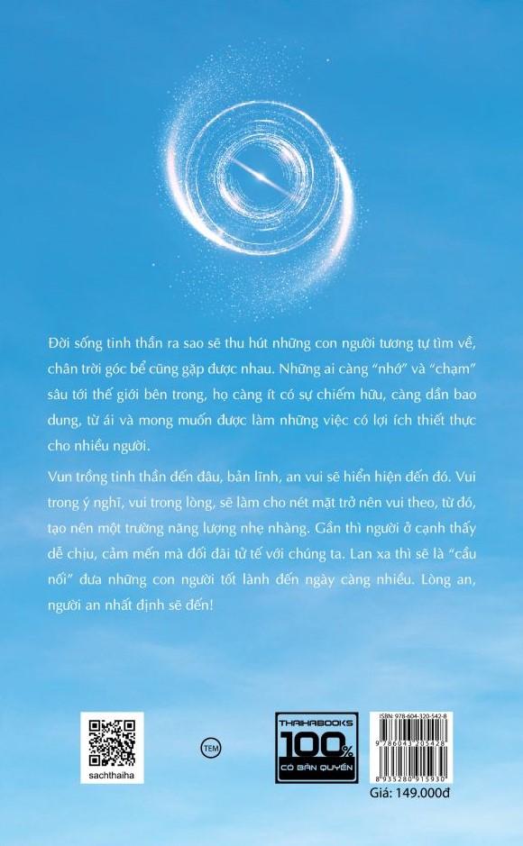 Lòng An - Người An Đến Nên những trang viết từ “Lòng an người an đến”, mong được cùng bạn thả lòng nhìn lại chặng hành trình đã bước qua với những xúc cảm chân thành của tình người. Nếu lúc nào đọc đến đoạn có cảm giác “quen quen” như m.ình đã từng gặp chuyện này ở đâu rồi, hãy để tâm thức tự vận hành. Rồi hẳn bạn sẽ nhớ ra một số chuyện, một ý nghĩa nào đó đưa đẩy chúng ta có mặt trên cuộc đời này. Cuốn sách là ghi chép những suy ngẫm trong quá trình rèn dưỡng thân tâm. Cảm đến đâu viết đến đó, trải nghiệm đến đâu chia sẻ đến đó. Thường sau thời đọc kinh, nghe pháp, tĩnh lặng cho tâm bớt lao xao, cho bản thân biết “nhìn sâu” về một vấn đề, m.ình mới bắt đầu viết. Các trang sách được viết ra cũng từ lúc lòng được an. Cũng như sau những kinh nghiệm đã có, nhìn lại m.ình và lắng nghe câu chuyện của nhiều người thông qua những dòng tin gửi về trên trang Fanpage Chuyện của Soul, m.ình hiểu ra phần nào lý do ai cũng hướng tìm về bình an. Ngoài kia, còn rất nhiều người chật vật, khổ về thân hoặc tâm. Với sức nhỏ bé, m.ình chỉ biết thông qua các dòng viết làm “cầu nối” cho mọi người tìm thấy nhau mà động viên, trợ lực. Đời sống tinh thần ra sao sẽ thu hút những con người tương tự tìm về, chân trời góc bể cũng gặp được nhau. Những ai càng “nhớ” và “chạm” sâu tới thế giới bên trong, họ càng ít có sự chiếm hữu, càng dần bao dung, từ ái và mong muốn được làm những việc có lợi ích thiết thực cho nhiều người. Vun trồng tinh thần đến đâu, bản lĩnh, an vui sẽ hiển hiện đến đó. Vui trong ý nghĩ, vui trong lòng, sẽ làm cho nét mặt trở nên vui theo, từ đó, tạo nên một trường năng lượng nhẹ nhàng. Gần thì người ở cạnh thấy dễ chịu, cảm mến mà đối đãi tử tế với chúng ta. Lan xa thì sẽ là “cầu nối” đưa những con người tốt lành đến ngày càng nhiều. Lòng an, người an nhất định sẽ đến! Nhẹ nhàng tốt, nhẹ nhàng thương! Nhẹ nhàng mỉm cười, nhẹ nhàng an! Nhẹ nhàng gặp gỡ, nhẹ nhàng chia xa. Người cần đi nhất định sẽ đi. Người cần đến nhất định sẽ đến! Đời này vẫn đẹp là vì, có một số đoạn duyên phải ngừng, số khác lại nảy nở. Tùy ngộ mà an, tùy duyên mà sống! Tác giả: Soul (Tánh Pháp) là một tác giả Việt, anh cũng là người sáng lập trang fanpage Chuyện của Soul trên ok. – Sách đã xuất bản:
