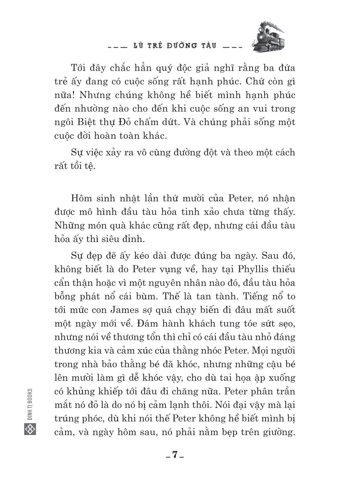 Kỳ thực chúng nào phải là trẻ đường tàu. Tôi đoán chừng là chúng chưa từng lăn tăn gì về đường tàu ngoại trừ ấy là phương tiện đưa chúng tới Maskelyne và Cooke để xem ảo thuật, coi kịch câm pantomime, đi chơi vườn bách thảo, và tham quan bảo tàng tượng sáp Madame Tussaud. Chúng chỉ là những đứa trẻ ngoại ô bình thường, sống cùng cha mẹ trong một căn biệt thự bình thường có mặt tiền ốp gạch đỏ, cửa ra vào lắp kính màu, một lối đi lát gạch gọi là hành lang, một phòng tắm có nước nóng lạnh, chuông điện, cửa sổ kiểu Pháp, tường quét vôi trắng, và “mọi tiện nghi hiện đại”, theo ngôn ngữ của cánh môi giới nhà đất.