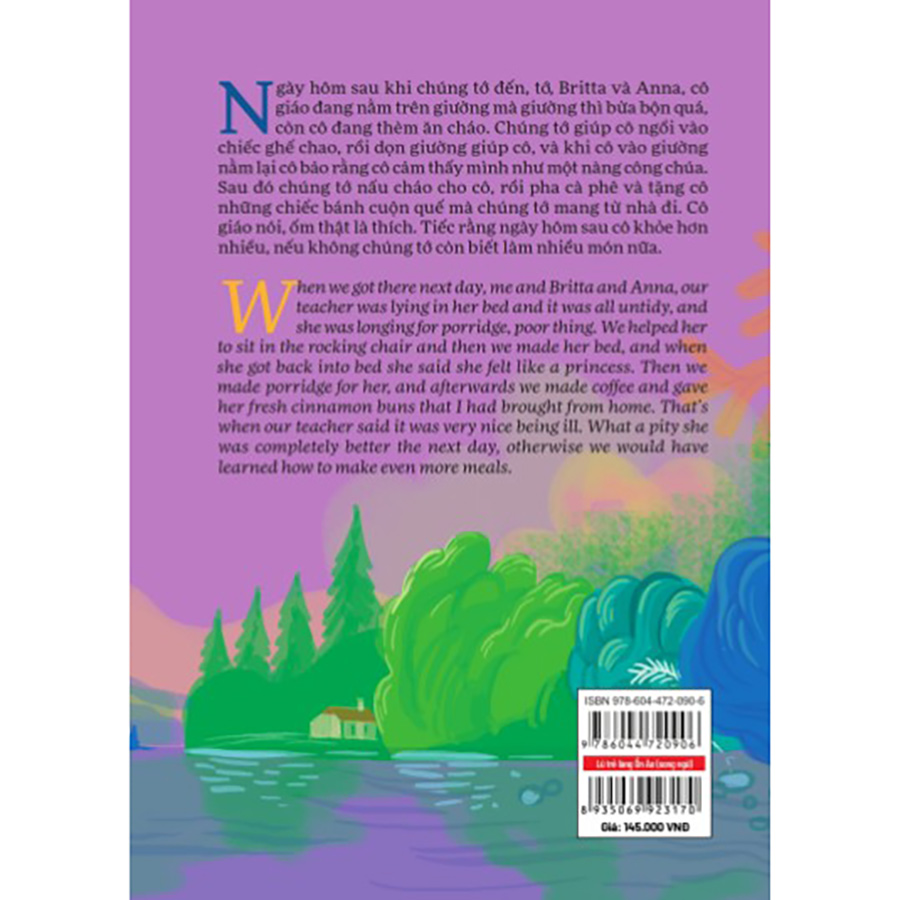 “Ngày hôm sau khi chúng tớ đến, tớ, Britta và Anna, cô giáo đang nằm trên giường mà giường thì bừa bộn quá, còn cô đang thèm ăn cháo. Chúng tớ giúp cô ngồi vào chiếc ghế chao, rồi dọn giường giúp cô, và khi cô vào giường nằm lại cô bảo rằng cô cảm thấy mình như một nàng công chúa. Sau đó chúng tớ nấu cháo cho cô, rồi pha cà phê và tặng cô những chiếc bánh bao vị quế mà chúng tớ mang từ nhà đi. Cô giáo nói, ốm thật là thích. Tiếc rằng ngày hôm sau cô khỏe hơn nhiều, nếu không chúng tớ còn biết làm nhiều món nữa.”