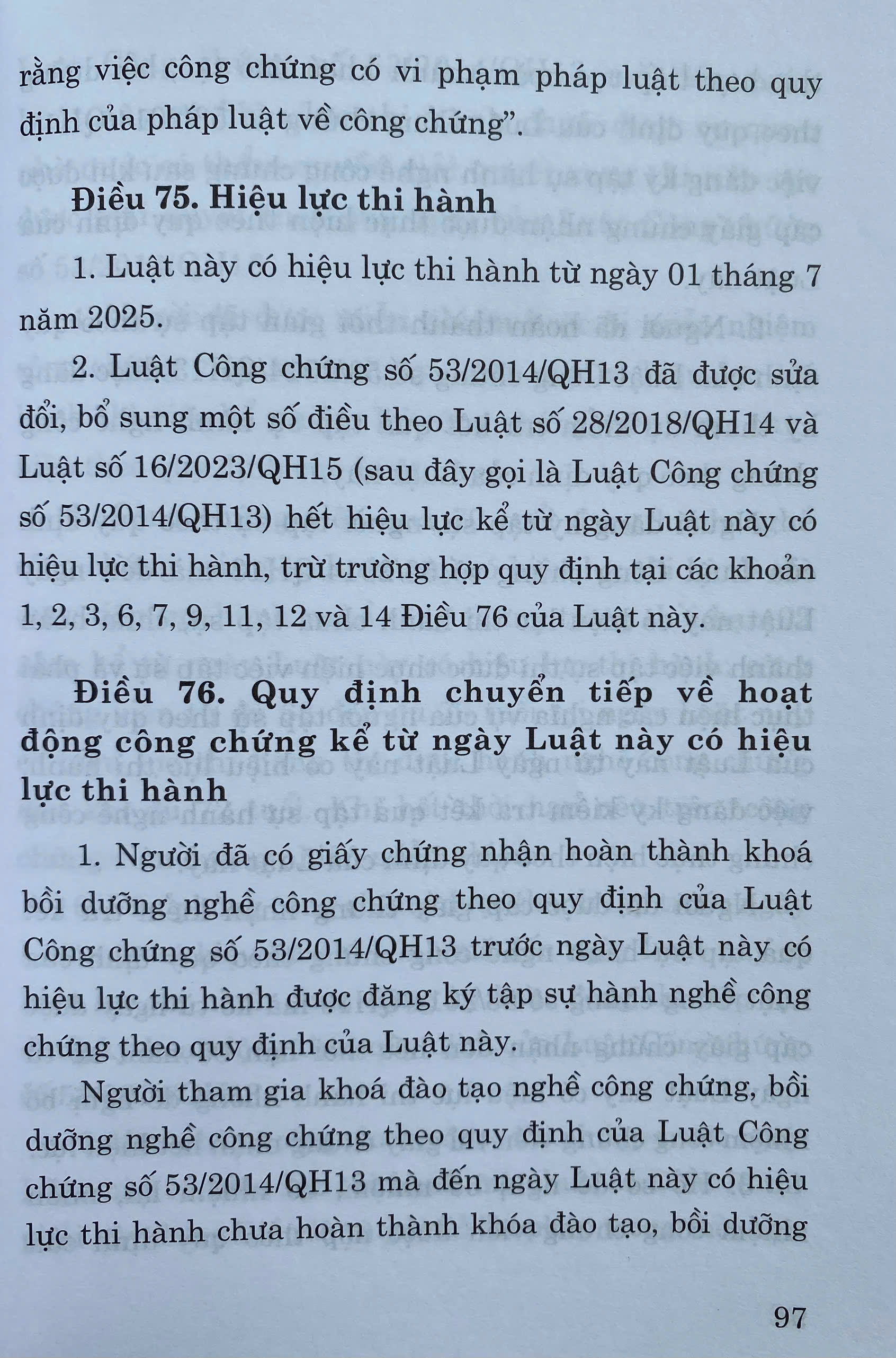 Luật Công Chứng số 46/2024/QH15 đã được Quốc Hội khoá XV thông qua tại kỳ họp thứ 8 ngày 26 tháng 11 năm 2024. Luật có hiệu lực áp dụng từ ngày 01 tháng 07 năm 2025. Luật gồm có 8 Chương, 76 điều.
