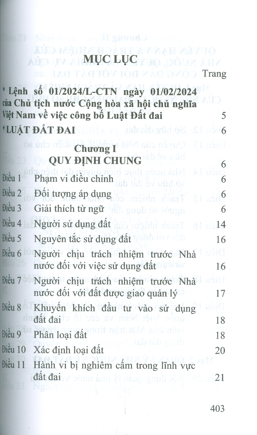 Ngày 18/01/2024, Quốc hội nước Cộng hòa xã hội chủ nghĩa Việt Nam thông qua Luật Đất đai số 31/2024/QH15, đã thể chế hóa đầy đủ, kịp thời các quan điểm, chủ trương của Đảng