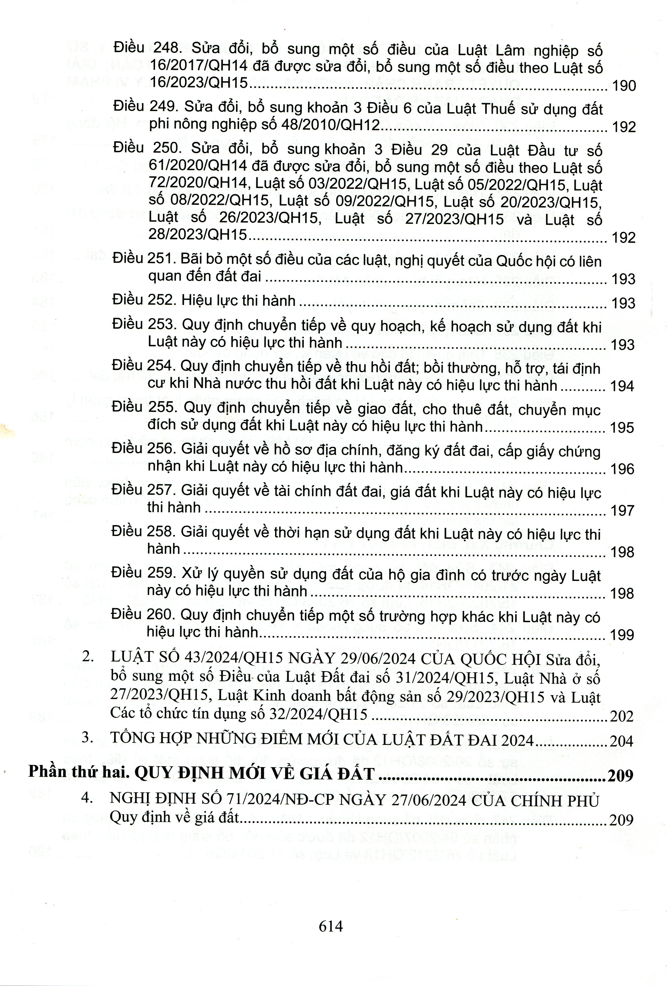 Luật Đất đai số 31/2024/QH15 được Quốc hội khóa XV thông qua ngày 18/01/2024. Luật gồm 16 chương, 260 điều, trong đó sửa đổi, bổ sung 180/212 điều của Luật Đất đai năm 2013 và bổ sung mới 78 điều.  Để sớm đưa Luật Đất đai vào cuộc sống, phù hợp với chủ trương của Đảng, khắc phục những tồn tại, hạn chế, nhất là trong công tác định giá đất, thu hồi đất, bồi thường, hỗ trợ tái định cư, ngày 29/6/2024 Quốc hội đã thông qua Luật sửa đổi, bổ sung một số điều của Luật Đất đai số 31/2024/QH15, Luật Nhà ở số 27/2023/QH15, Luật Kinh doanh bất động sản số 29/2023/QH15, Luật Các tổ chức tín dụng số 32/2024/QH15. Để giúp bạn đọc thuận tiện tra cứu, tham khảo Luật Đất đai, Luật sửa đổi, bổ sung một số điều của Luật Đất đai số 31/2024/QH15, và các nghị định hướng dẫn thi hành mới nhất, Pháp luật Sài Gòn Hà Nội phối hợp với Nhà xuất bản Lao Động xuất bản và phát hành cuốn sách: LUẬT ĐẤT ĐAI (sửa đổi, bổ sung) VÀ VĂN BẢN HƯỚNG DẪN THI HÀNH VỀ GIÁ ĐẤT, BỒI THƯỜNG, HỖ TRỢ, TÁI ĐỊNH CƯ KHI NHÀ NƯỚC THU HỒI ĐẤT Nội dung cuốn sách gồm các phần chính sau: Phần thứ nhất. LUẬT ĐẤT ĐAI 2024 Phần thứ hai. QUY ĐỊNH MỚI VỀ GIÁ ĐẤT Phần thứ ba. QUY ĐỊNH VỀ BỒI THƯỜNG, HỖ TRỢ, TÁI ĐỊNH CƯ KHI NHÀ NƯỚC THU HỒI ĐẤT Phần thứ tư. QUY ĐỊNH XỬ PHẠT VI PHẠM HÀNH CHÍNH TRONG LĨNH VỰC ĐẤT ĐAI Quyển sách trong quá trình hệ thống khó tránh khỏi những thiếu sót, kính mong độc giả góp ý để lần tái bản sau được hoàn thiện hơn. Sách có độ dày 400 trang, giá phát hành 425.000đ/1 quyển Trân trọng giới thiệu cùng bạn đọc.
