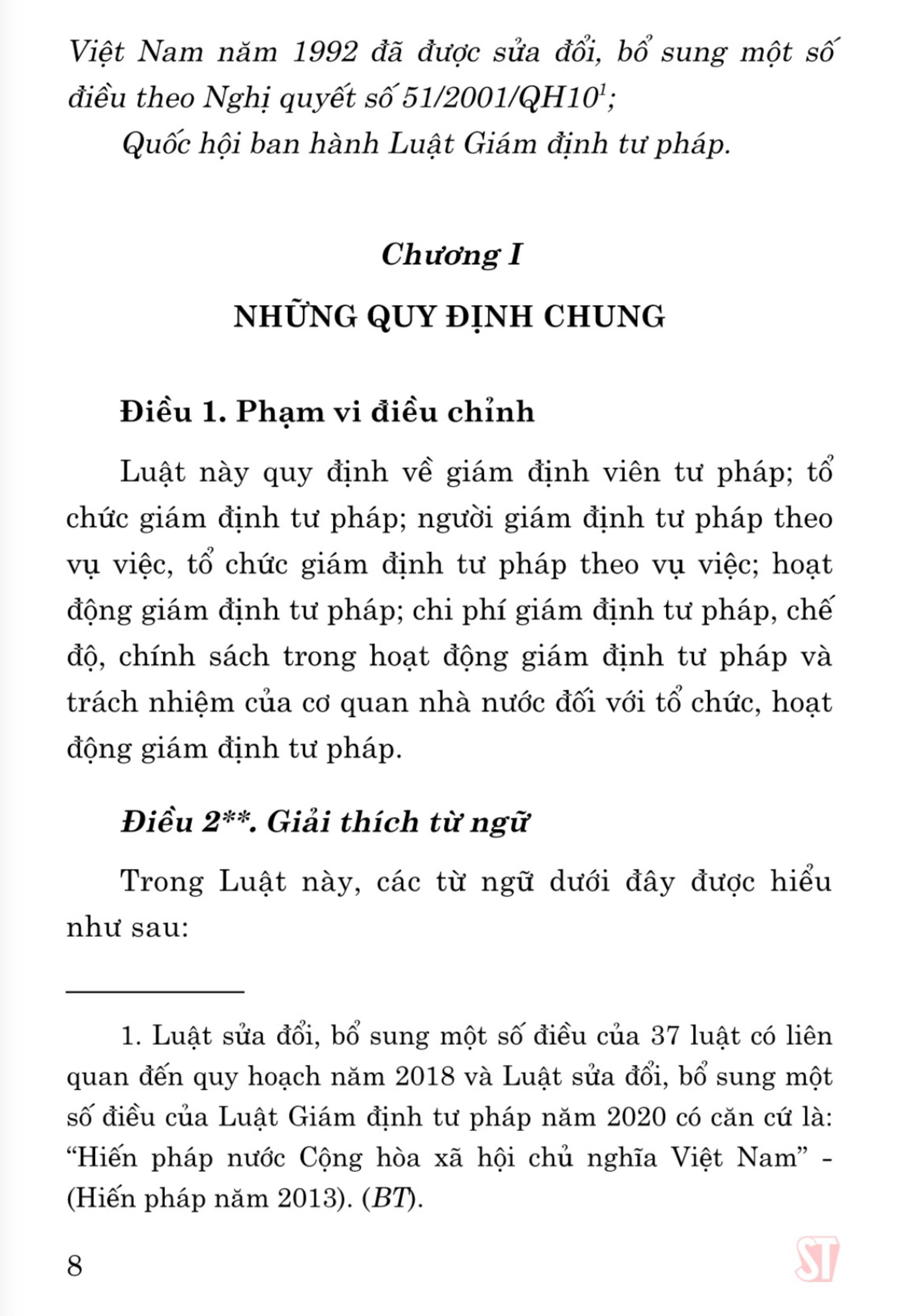 Luật Giám định tư pháp (hiện hành) (sửa đổi, bổ sung năm 2018, 2020) gồm 7 chương, 46 điều, quy định về: giám định viên tư pháp; tổ chức giám định tư pháp; người giám định tư pháp theo vụ việc, tổ chức giám định tư pháp theo vụ việc; hoạt động giám định tư pháp; chi phí giám định tư pháp, chế độ, chính sách trong hoạt động giám định tư pháp và trách nhiệm của cơ quan nhà nước đối với tổ chức, hoạt động giám định tư pháp. Luật Giám định tư pháp được Quốc hội khóa XIII, kỳ họp thứ 3 thông qua ngày 20/6/2012 và được sửa đổi, bổ sung vào các năm 2018, 2020. Cuốn sách Luật Giám định tư pháp (hiện hành) (sửa đổi, bổ sung năm 2018, 2020) là văn bản luật hợp nhất của Luật Giám định tư pháp năm 2012 và các nội dung của hai lần sửa đổi tạo thành một văn bản Luật Giám định tư pháp thống nhất hiện hành và mới nhất thuận tiện trong sử dụng tra cứu tham khảo.