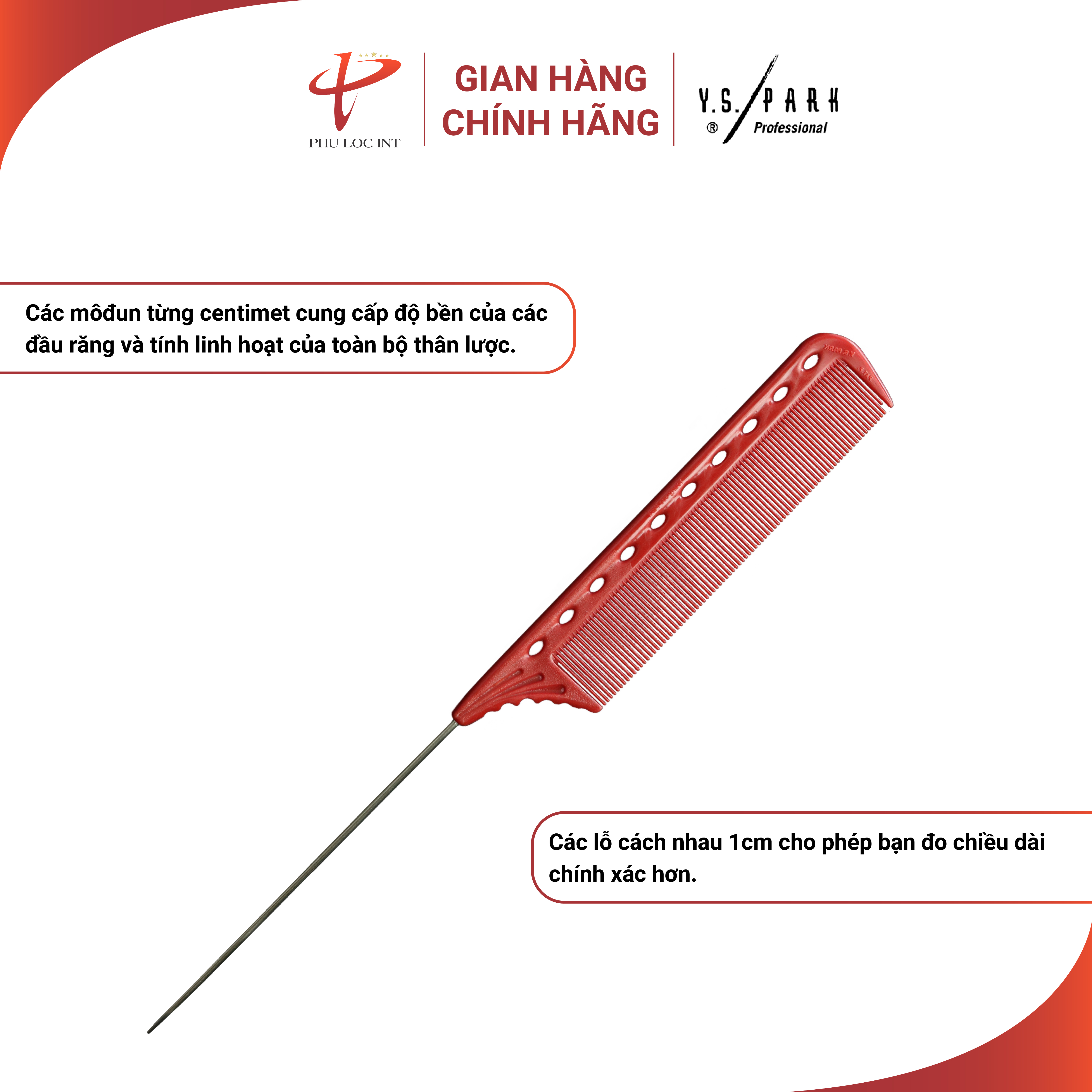 - Các lỗ mô-đun từng centimet cung cấp độ bền của các đầu răng và tính linh hoạt của toàn bộ thân lược. Các lỗ cách nhau 1cm cho phép bạn đo chiều dài chính xác hơn.