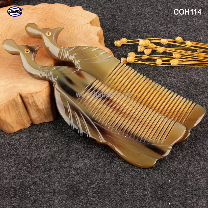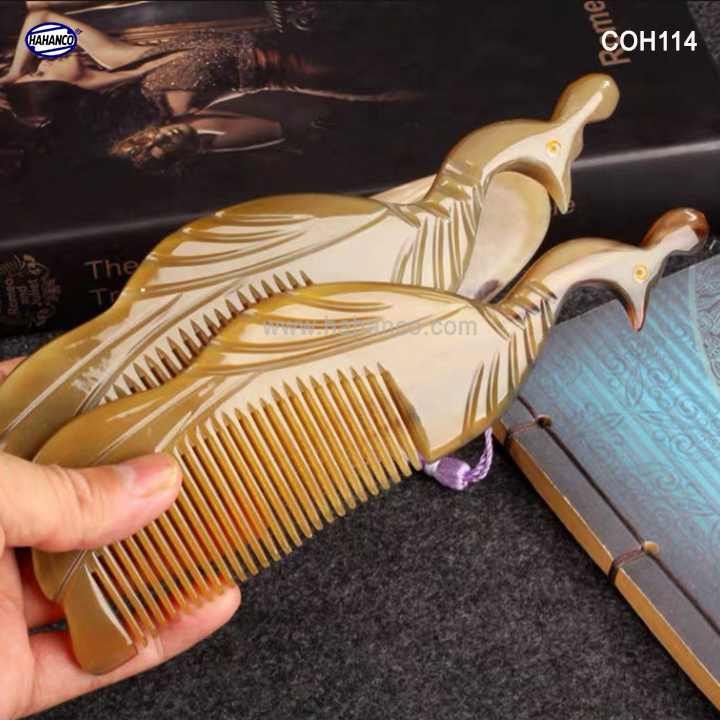 Mua tại TiktokLược sừng xuất khẩu sang thị trường Nhật Bản, EU, US. Lược sừng hình Công trong bộ sưu tập các con vật, con giáp. COH114 được các nghệ nhân làm thủ công tạo hình con Công và tỉa tách những chi tiết nhỏ rất đẹp, chiếc lược dày dặn và làm bóng bảy rất kỹ. Được tỉa hình hai mặt giống nhau. Mẫu lược này được sản xuất nhiều công đoạn phức tạp, các đường nét khía sâu vào thân lược rất tỉ mỉ và chi tiết, uốn lượn tinh xảo. Những chiếc răng lược được các bàn tay khéo léo mài dũa từng chiếc một cẩn thận để đạt được độ nhẵn bóng, khi chải tóc sẽ không làm gãy và rụng tóc. Mô tả sản phẩm: