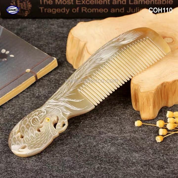 Đây là mẫu lược VIP được các nghệ nhân làm thủ công tạo hình con Phượng cuốn, được cắt khía vào thân lược kết hợp với những đường tỉa tách họa tiết sống động trên thân lược, chiếc lược dày dặn và làm bóng bảy rất kỹ.