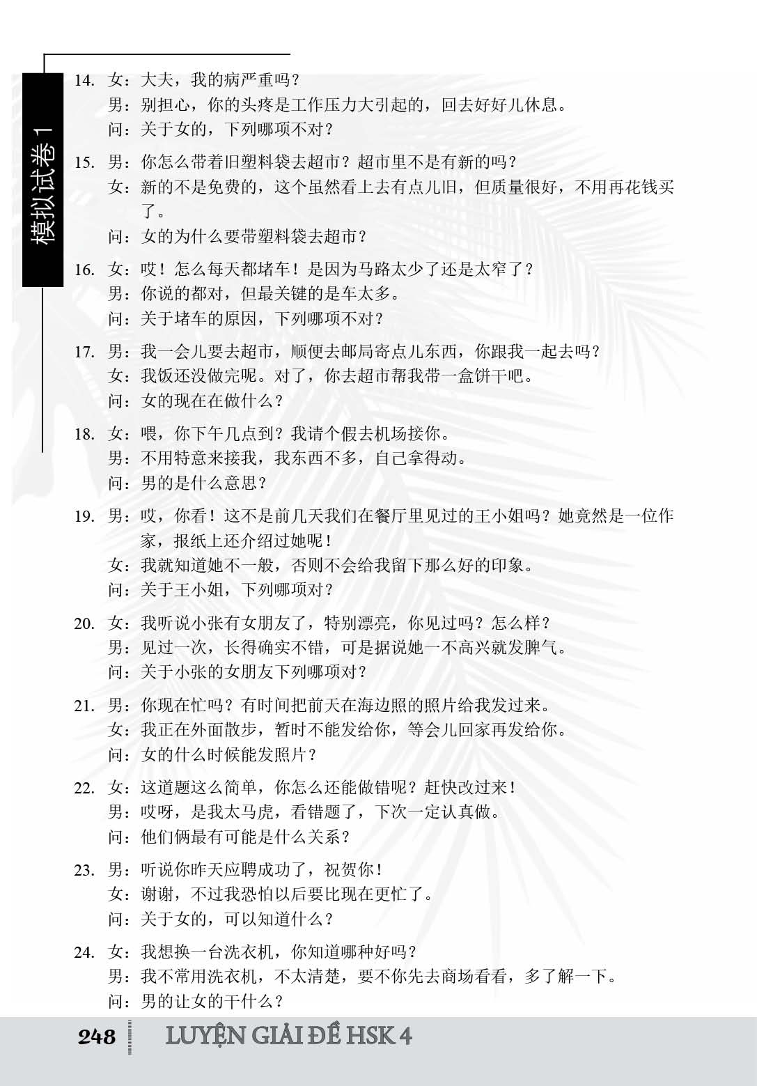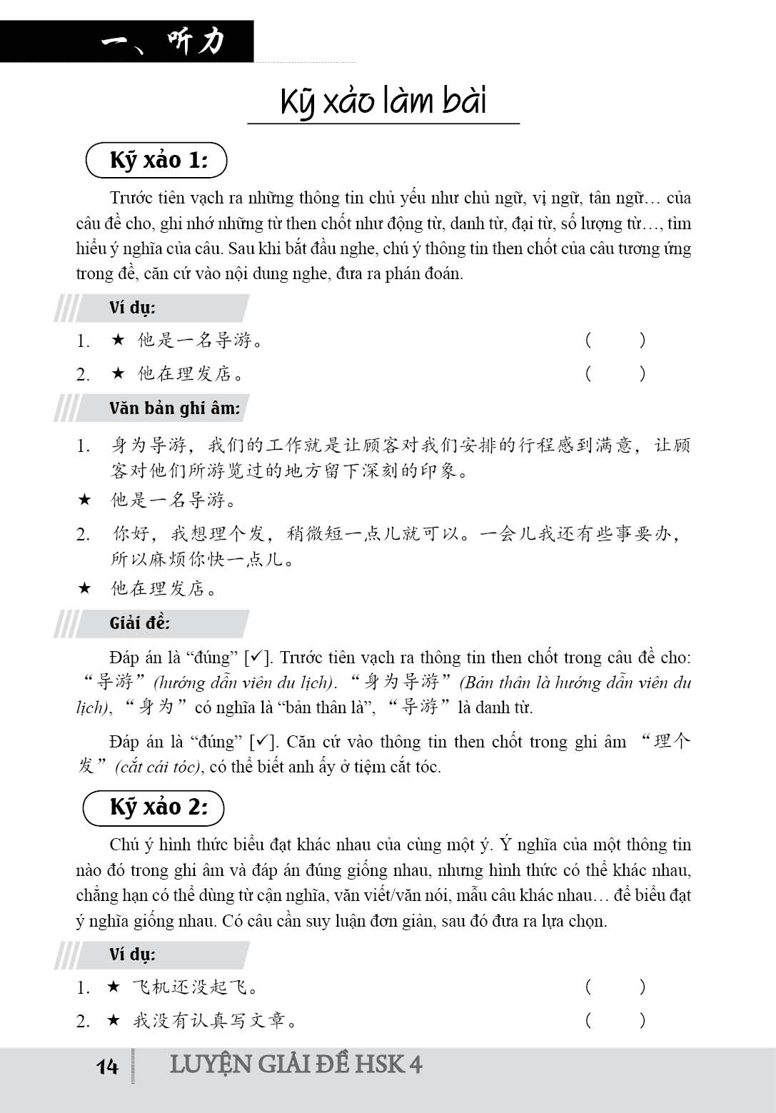 - Phần 3: Thuyết minh đáp án (cung cấp Văn bản ghi âm, Đáp án và Thuyết minh đáp án của 12 đề mô phỏng ở phần 2) Ngoài những đề thi mô phỏng ở phần 2, sách Luyện giải đề HSK cấp 4 còn có hệ thống bài tập thuộc phần 1 (Phần Những kỹ xảo giải đề). Hệ thống bài tập này bao gồm 2 nhóm: nhóm Bài tập kỹ xảo và nhóm Bài tập tính giờ.