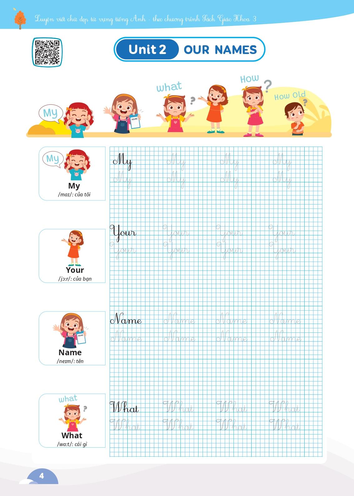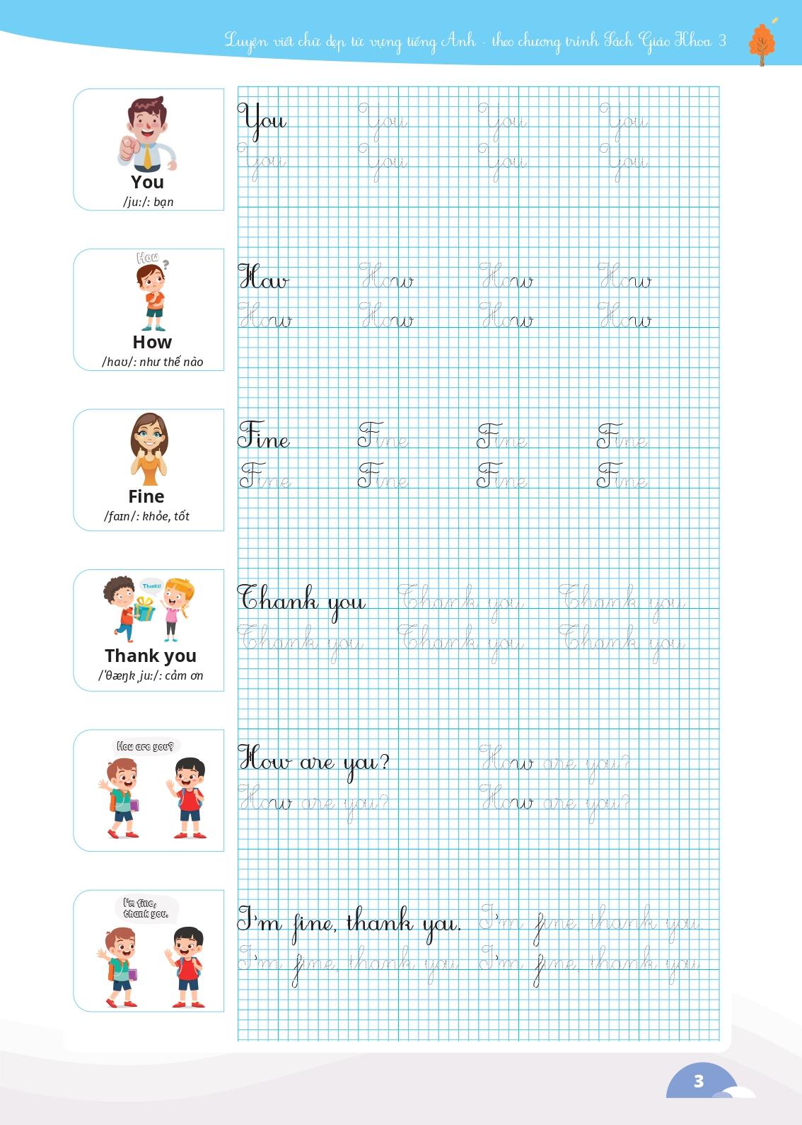 Luyện viết chữ đẹp từ vựng tiếng Anh - theo chương trình Sách giáo khoa - là bộ tập viết được biên soạn cho các bé học sinh từ lớp 1 đến lớp 3, hỗ trợ các bé học hiệu quả, ghi nhớ nhanh từ vựng theo chương trình học trên lớp.