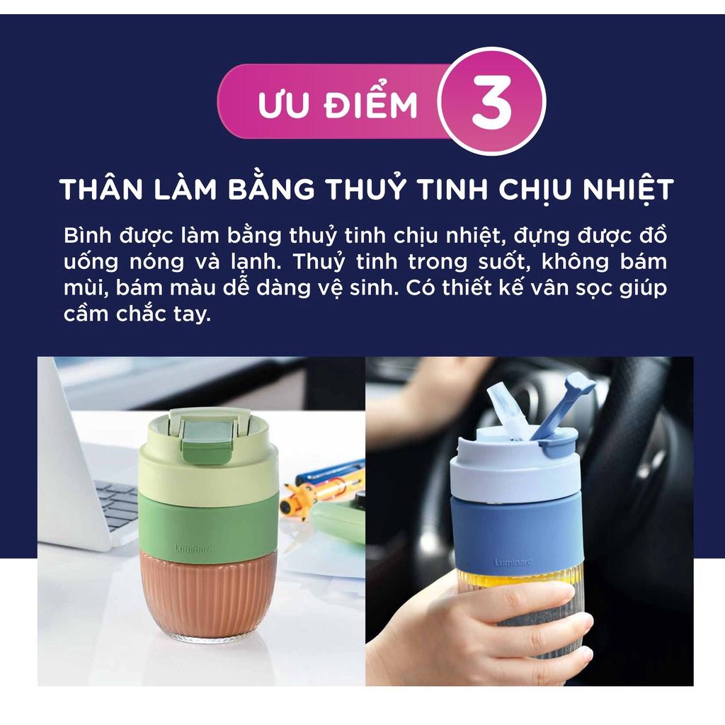 Ly thủy tinh có nắp Lumiarc Coffee Cup có nắp uống kéo tiện lợi chắc chắn, cho phép người dùng uống bằng 2 hình thức là bật mở uống trực tiếp hoặc bật mở ống hút uống một cách dễ dàng. Lót bình bằng sillione bên ngoài giúp bạn dễ dàng cầm nắm, không bị trơn trượt, tăng thêm thẩm mĩ, sang trọng, nâng cao trải nghiệm cho người dùng. Thân làm bằng thủy tinh chịu nhiệt, đựng được đồ uống nóng và lạnh, thùy tinh trong suốt không bám mùi, bám màu và dễ dàng vệ sinh, có thiết lế vân sọc giúp cầm chắc tay. Đây là sản phẩm đắc lực để hỗ trợ gia đình bạn, bạn có thể sử dụng và mang đi bất cứ đâu mà bạn muốn.