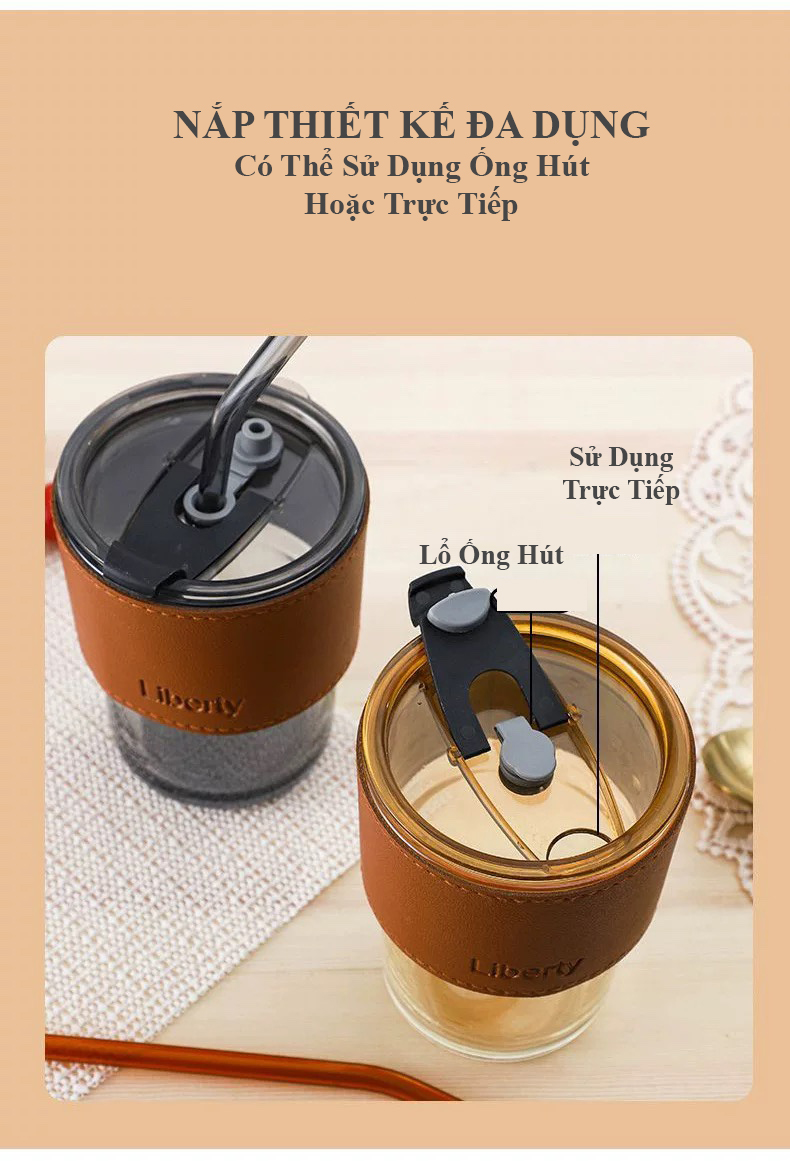 Sản phẩm: gồm 1 ly, 1 nắp, 1 ống hút thủy tinh