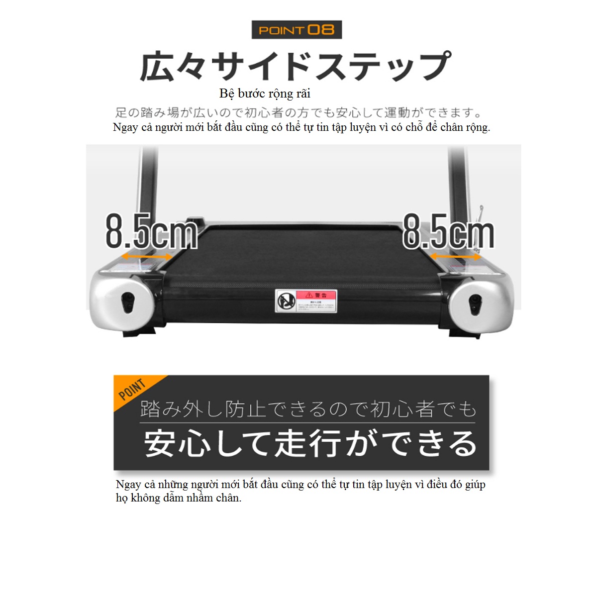 MÁY CHẠY BỘ KINGSPORT BK-8000 ĐA NĂNG - SỰ LỰA CHỌN TỐI ƯU CHO CẢ NHÀ CÙNG KHỎE ️ Thiết kế sang trọng và hiện đại phù hợp với mọi không gian ️ Khung sườn chắc chắn đảm bảo độ an toàn cao ️ Màn hình LCD hiển thị các thông số đo thời gian, quãng đường, vận tốc và calories ️ Thảm chạy Diamond nhiều lớp chống ồn và trơn trượt, rộng rãi lên đến 1260x420 mm ️ 12 chương trình luyện tập đa dạng để lựa chọn ️ Sở hữu tay cầm được tích hợp chương trình cảm biến nhịp tim ️ Tích hợp tính năng tra dầu tự động giúp máy vận hành tốt hơn ️ Động cơ mạnh mẽ và vượt trội với khả năng chạy tốc độ cao lên đến 14km/h ️ Trang bị thanh gập bụng và đai massage giúp tối ưu hiệu quả tập luyện ️ Bàn phím cơ siêu bền dễ dàng sử dụng ️ Hệ thống giảm sốc thông minh giúp giảm chấn thương trong quá trình tập ️ Nghe nhạc giải trí với âm thanh sống động: jack 3.5 và Bluetooth THÔNG SỐ KỸ THUẬT -