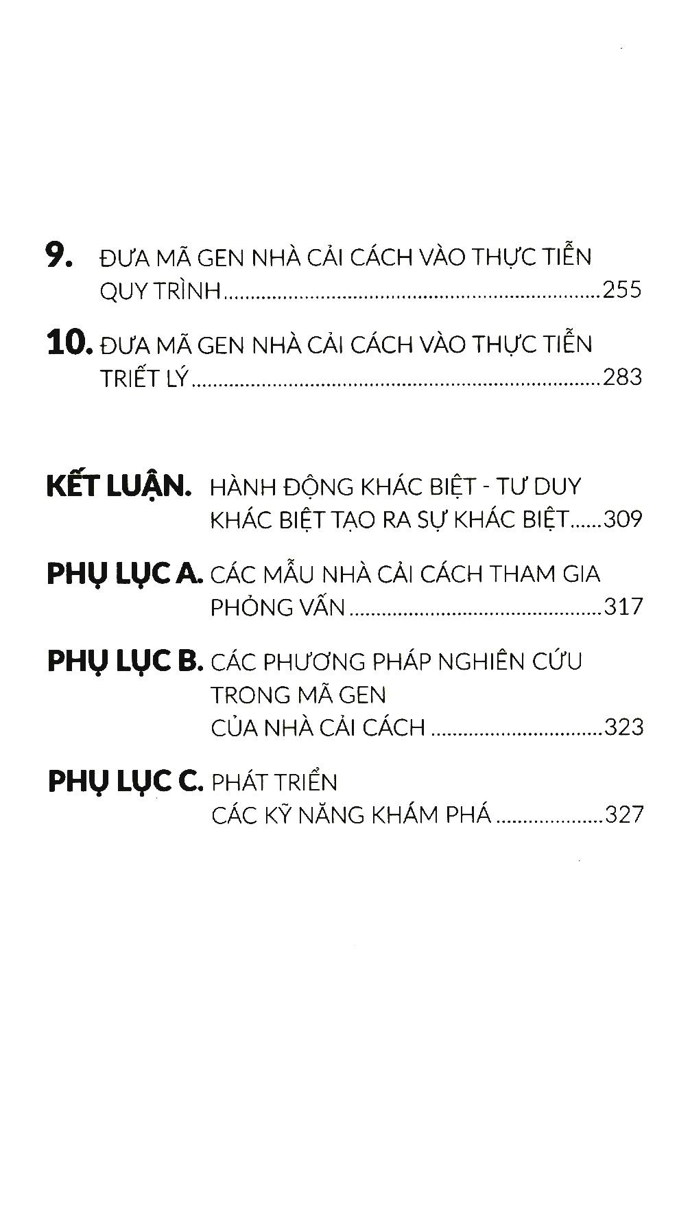 Mã gen của nhà cải cách thảo luận chính những câu hỏi căn cốt này – và còn hơn thế nữa. Là kết quả của một công trình nghiên cứu kéo dài suốt tám năm trời của nhiều tác giả, trong đó mọi người cùng nhau kiếm tìm một quan niệm toàn diện hơn về các nhà cải cách đột phá – họ là ai và những doanh nghiệp cách tân mà họ sáng tạo nên là gì, cuốn sách sẽ hé mở nguồn gốc của những ý tưởng kinh doanh cách tân – và thường là, mang tính đột phá. phỏng vấn gần một trăm nhà sáng chế các sản phẩm và dịch vụ mang tính cách mạng, cũng như các nhà sáng lập và CEO của những doanh nghiệp đóng vai trò biến-đổi-cuộc-chơi vốn xây dựng dựa trên những ý tưởng kinh doanh cách tân. Mục tiêu của cuốn sách không nhằm vào việc điều tra chiến lược các doanh nghiệp, mà hơn thế, là đào sâu tìm hiểu tư tưởng của bản thân các nhà cải cách với mong muốn thấu hiểu tối đa những con người này, bao gồm trong đó cả khoảng khắc (khi nào và ra sao) họ đưa ra những ý tưởng khởi phát những sản phẩm hay doanh vụ mới mẻ.