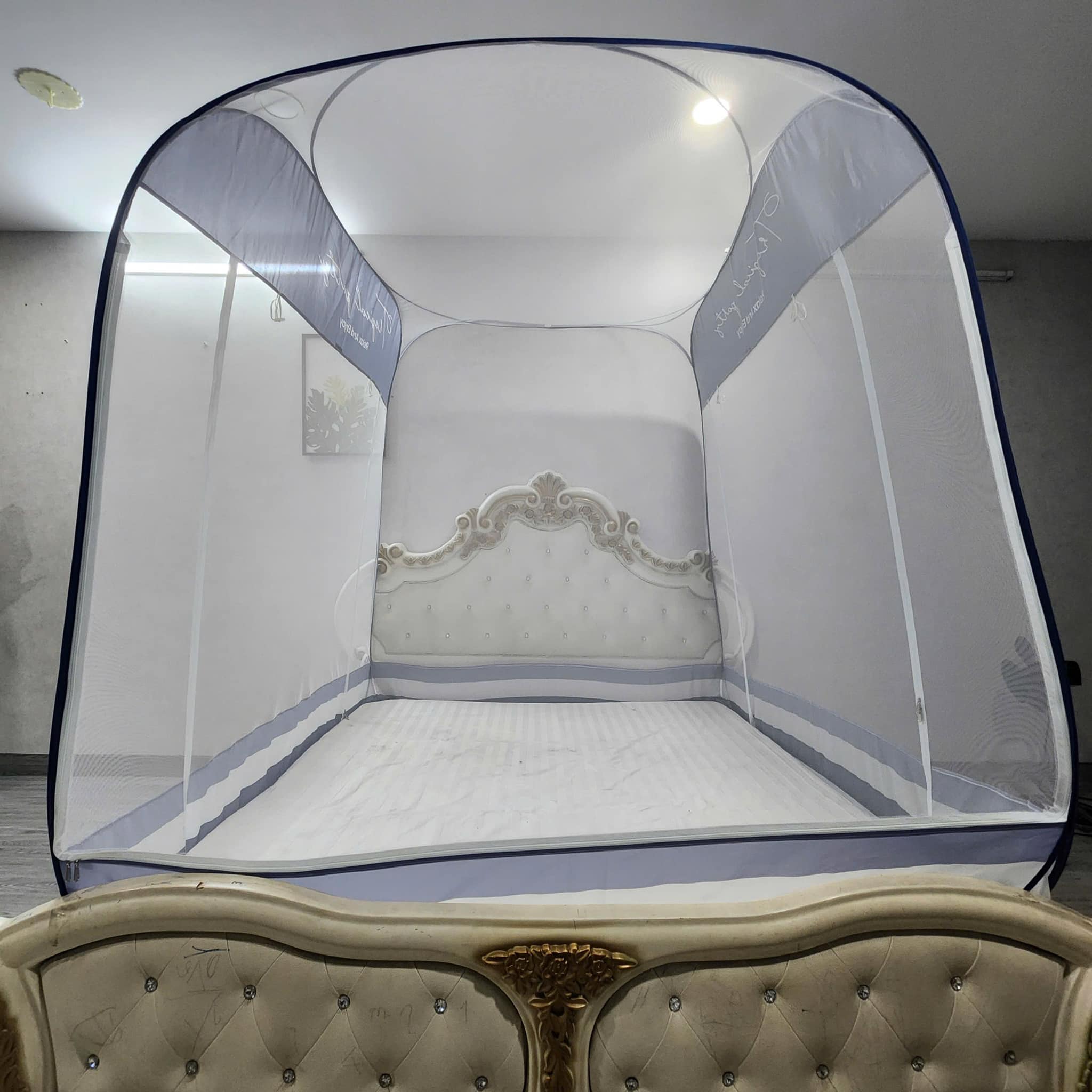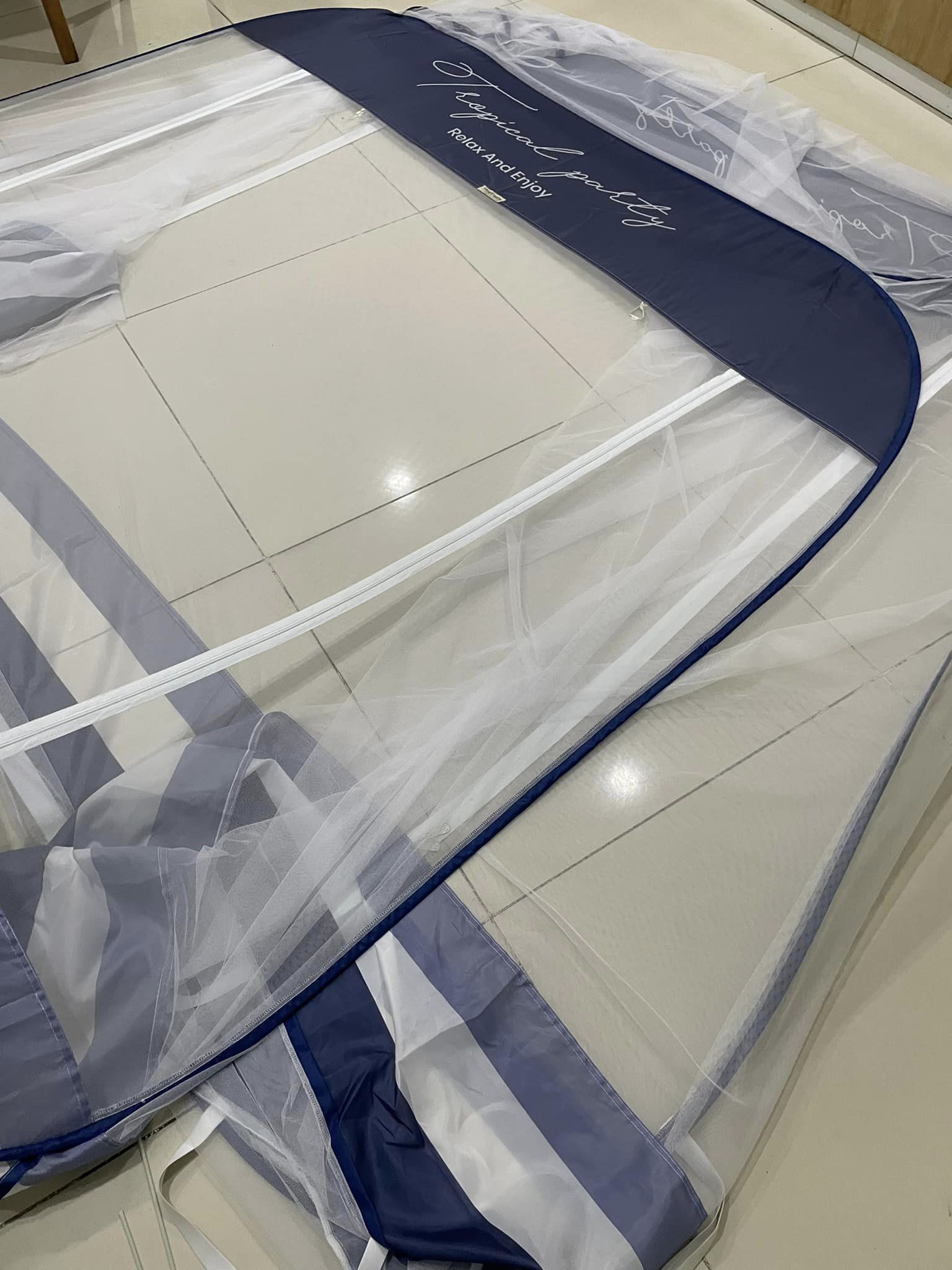 Kiểu dáng: Đỉnh rộng, có 3 cửa ra vào, có viền chân là từ vải thay vì lưới mùng ( giúp bảo vệ 100% khi để tay chân chạm sát mùng)