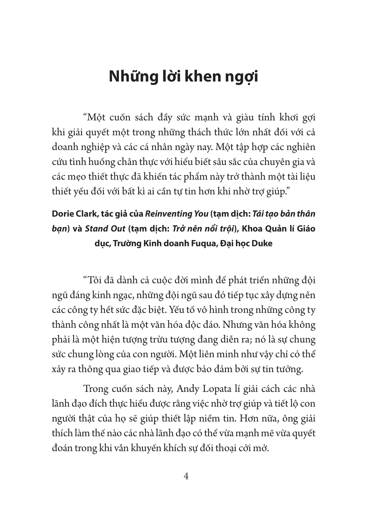Trong cuốn sách này, tác giả Andy Lopata khám phá sự thay đổi cần thiết trong tư duy để ta có thể đón nhận sự hỗ trợ từ các mạng lưới của m.ình và sức mạnh của việc đó. Ông cũng thảo luận về tác động của tính minh bạch đối với thành tích của cá nhân và tập thể, đồng thời minh họa bằng các nghiên cứu điển hình dựa trên các cuộc phỏng vấn độc quyền về cách điều này ảnh hưởng đến mọi người thuộc tầng lớp xã hội.