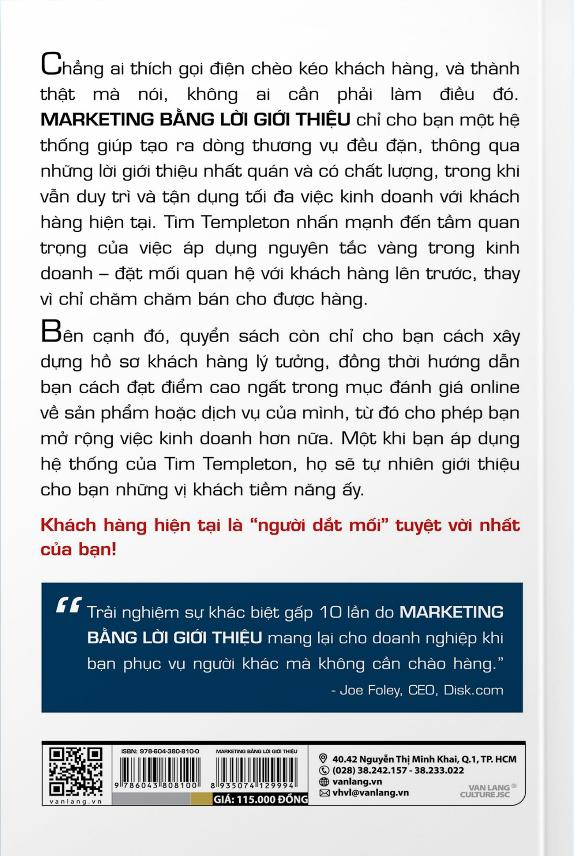 Chẳng ai thích gọi điện chèo kéo khách hàng, và thành thật mà nói, không ai cần phải làm điều đó. Marketing bằng lời giới thiệu chỉ cho bạn một hệ thống giúp tạo ra dòng thương vụ đều đặn, thông qua những lời giới thiệu nhất quán và có chất lượng, trong khi vẫn duy trì và tận dụng tối đa việc kinh doanh với khách hàng hiện tại. Tim Templeton nhấn mạnh đến tầm quan trọng của việc áp dụng nguyên tắc vàng trong kinh doanh – đặt mối quan hệ với khách hàng lên trước, thay vì chỉ chăm chăm bán cho được hàng.